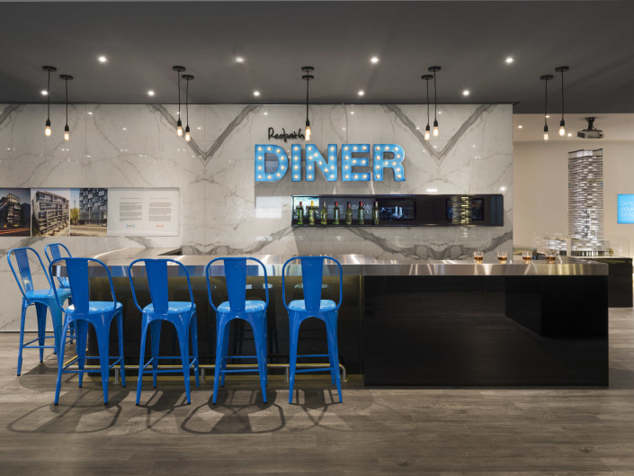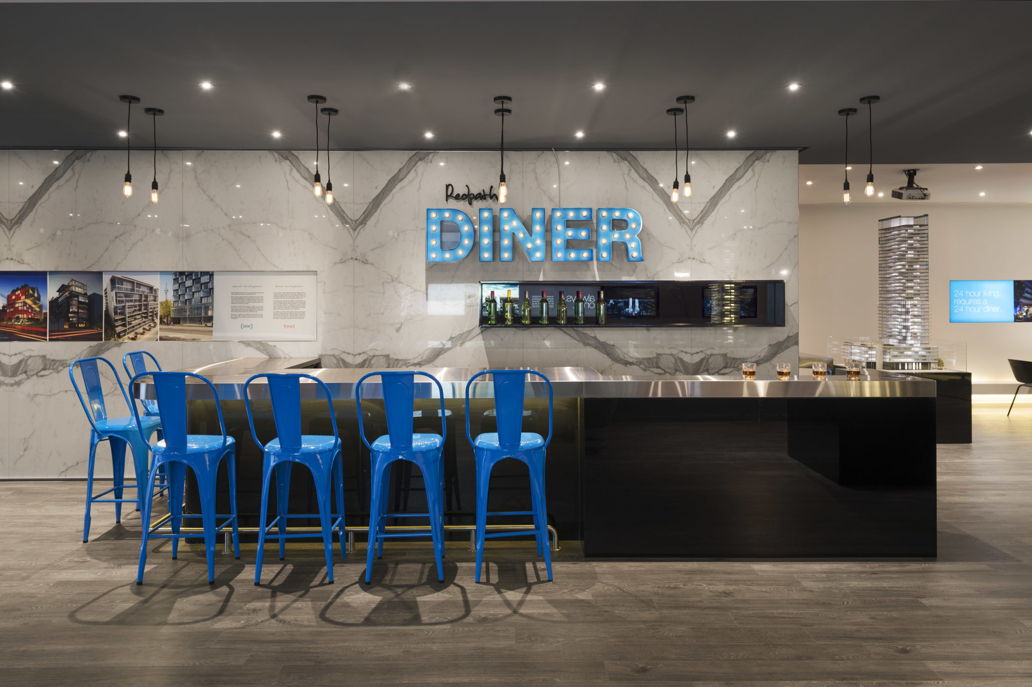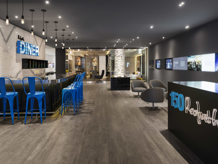 150 Redpath is a sales centre for a condominium development located at the southwest corner of Redpath and Roehampton Avenues in the newly reimagined Yonge and Eglinton neighbourhood – envisioned as a sanctuary of comfort and indulgence for the young, urbane professional. A dichotomy containing a 24 hour bar catering to the busy and social lifestyle of the residents, it is also intended to be a place of refuge from stressful surroundings – a haven for rejuvenation through relaxation and play.