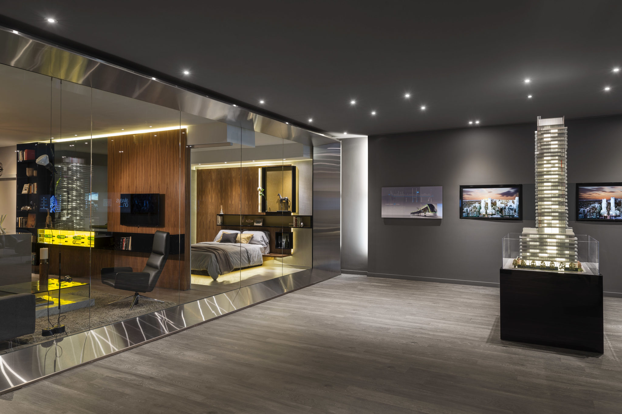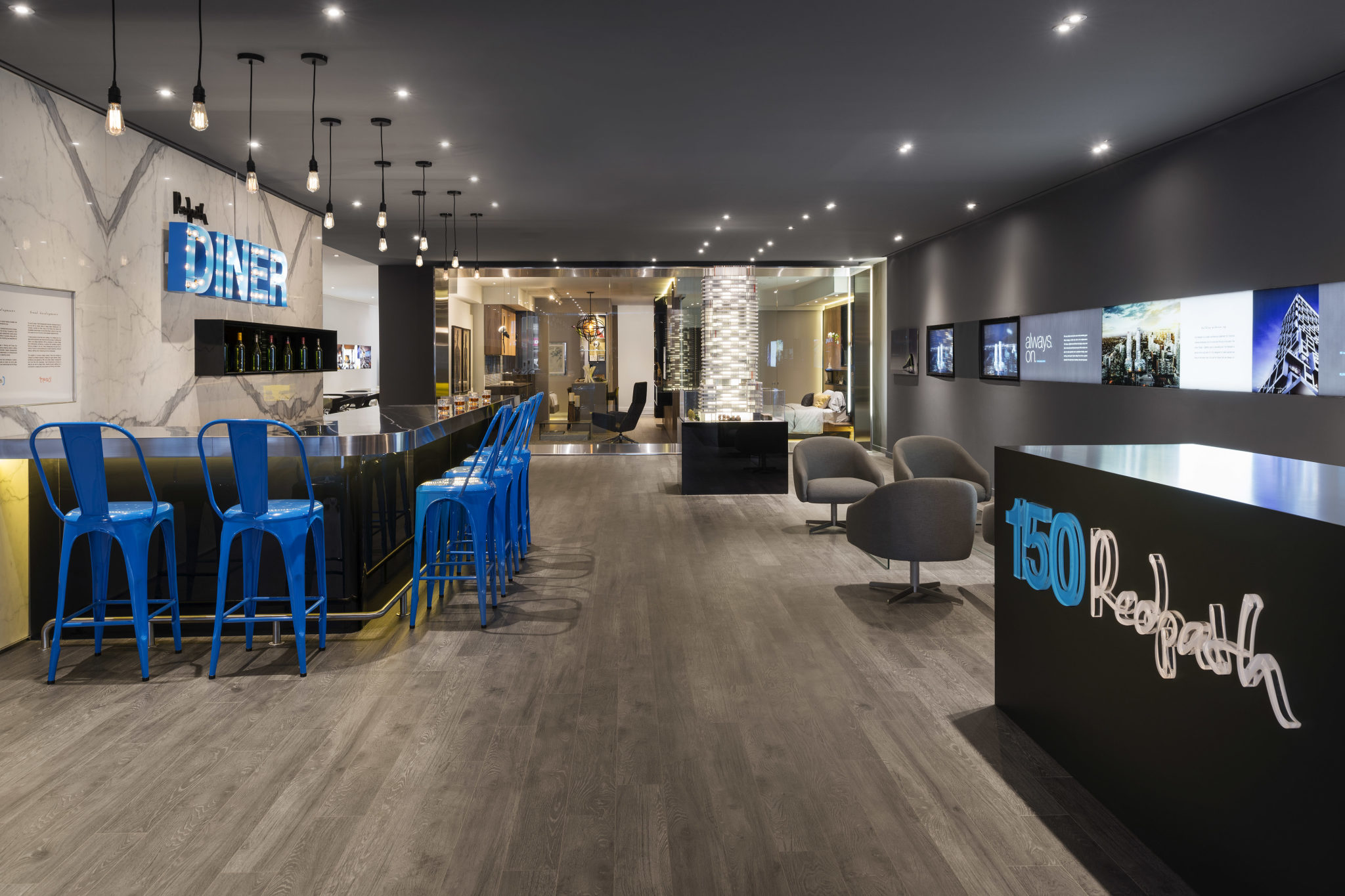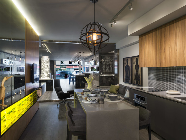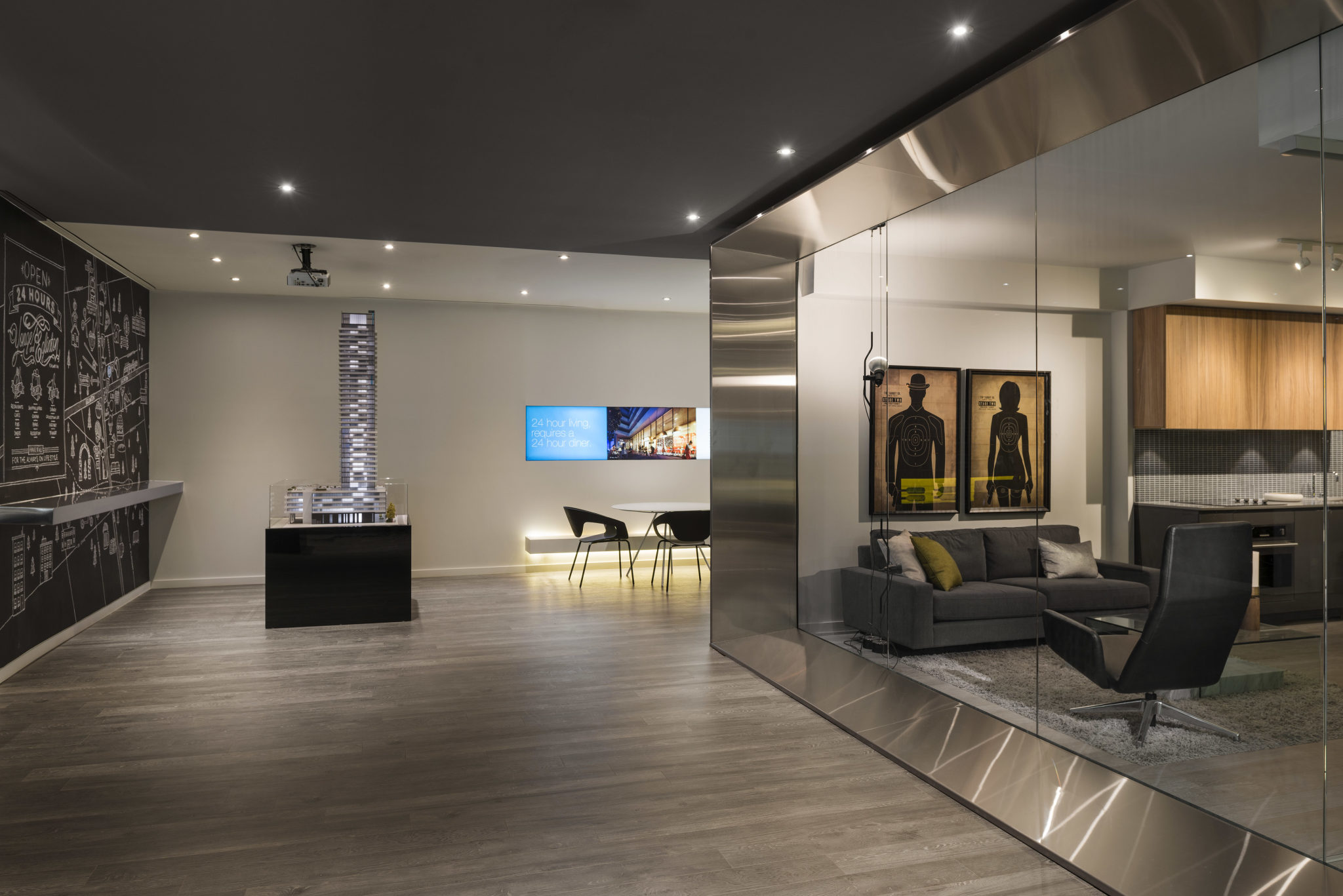 Viewed from the entrance, a reception area and simulated “24 hour” bar, suggesting the concept of the development define the reception area and lounge. One’s view is then focused towards a stainless steel “frame” forming a backdrop to the illuminated building model and the model suite beyond.