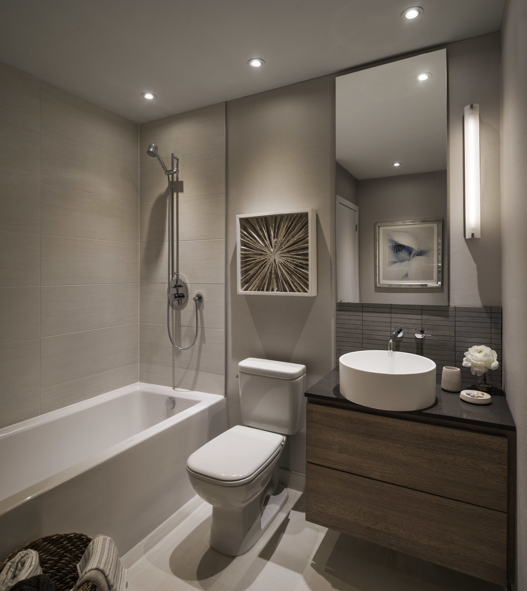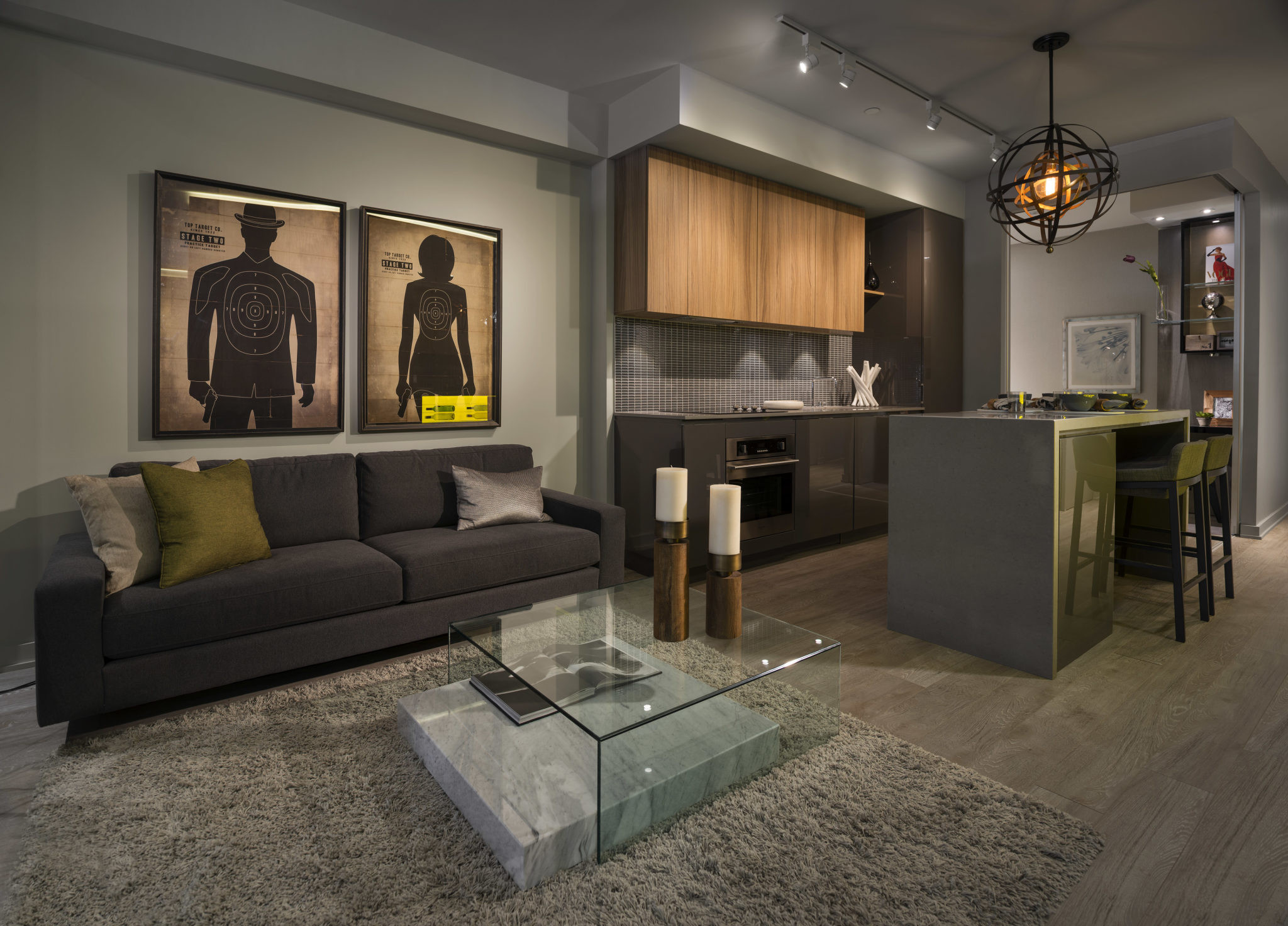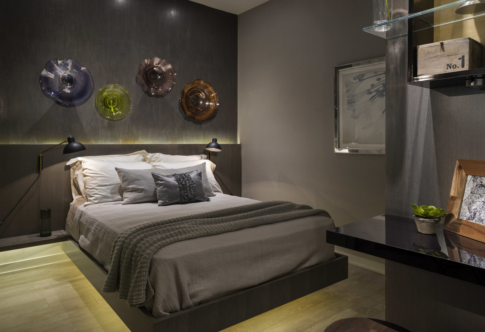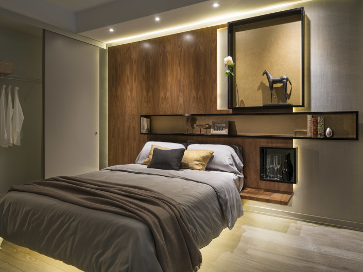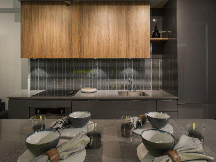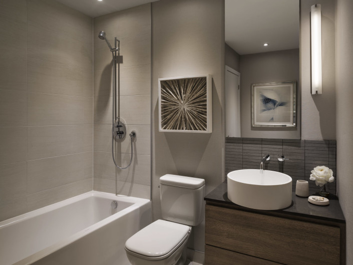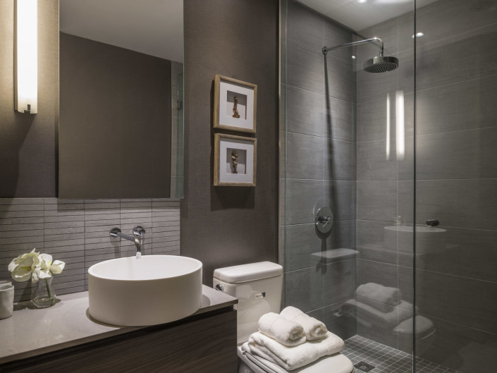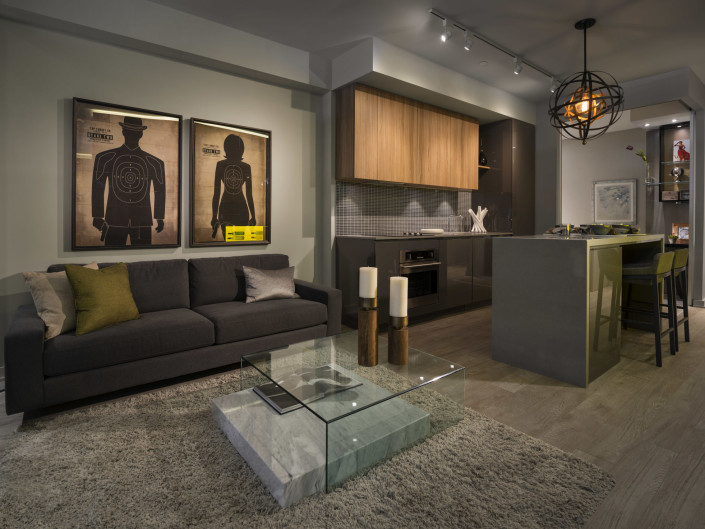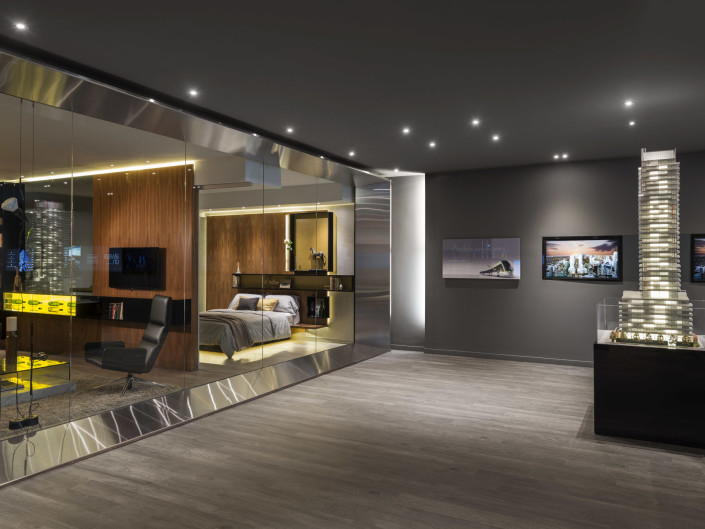 The concept of the model suite is to envision a “lifestyle of collection” – despite the suite’s compact dimensions – facilitated by custom millwork details to hold wine, books, artifacts, photographs and workspaces. The suite is enveloped in rich, luxurious textures and warm, earthly tones supporting the notion of an elegant retreat for the 24 hour lifestyle.