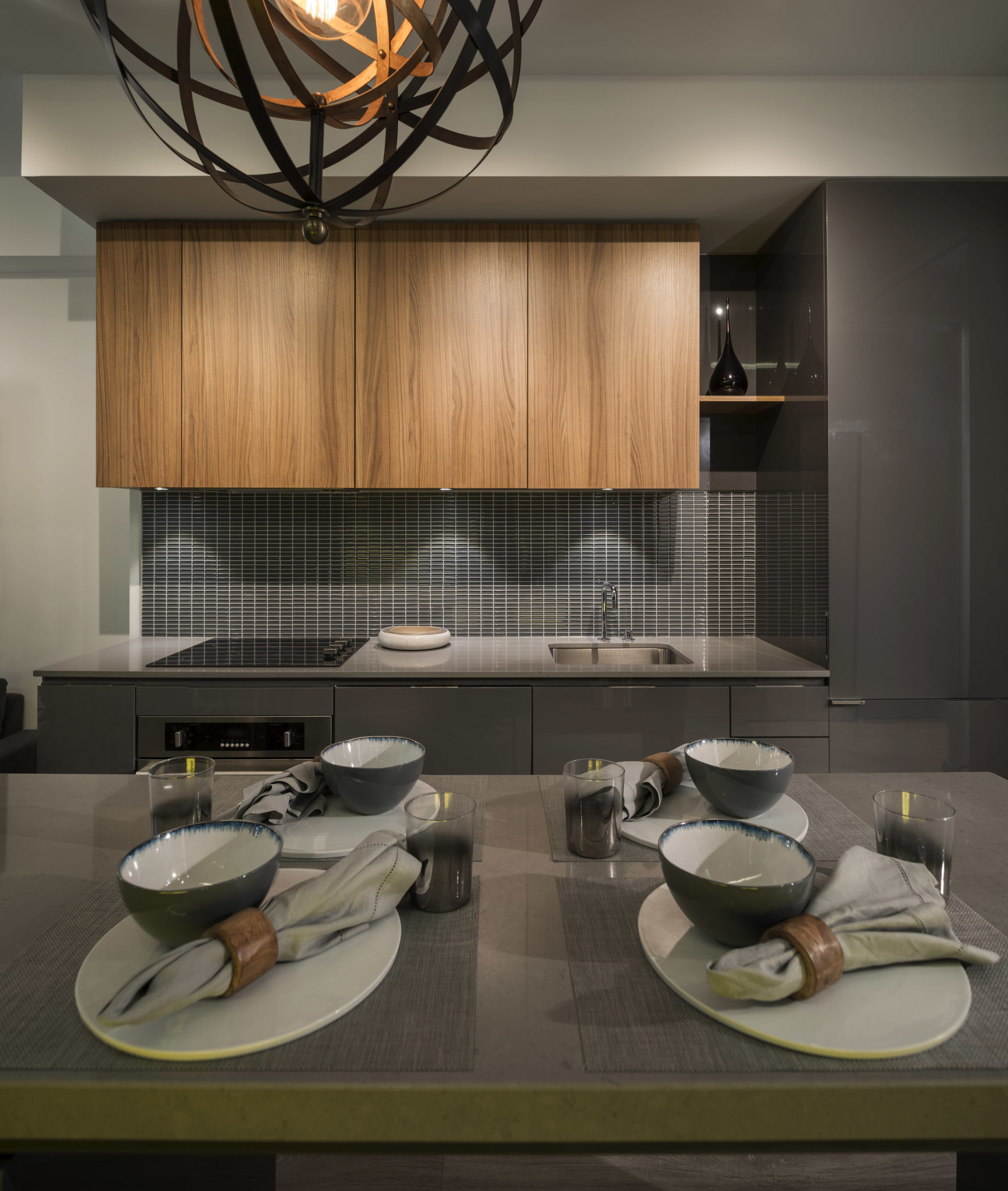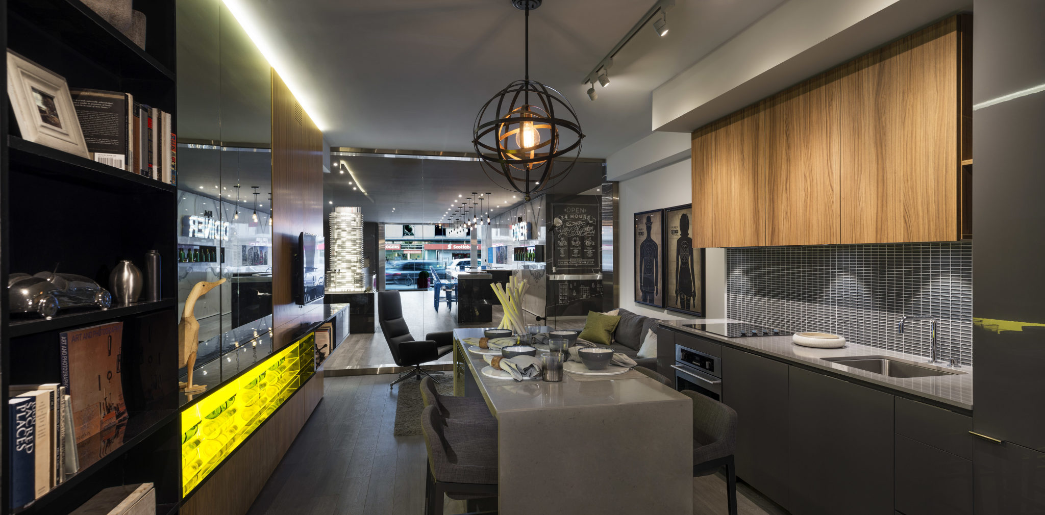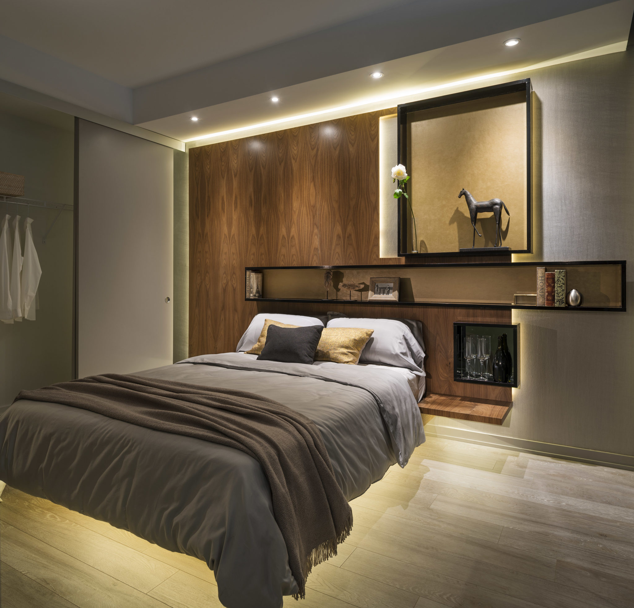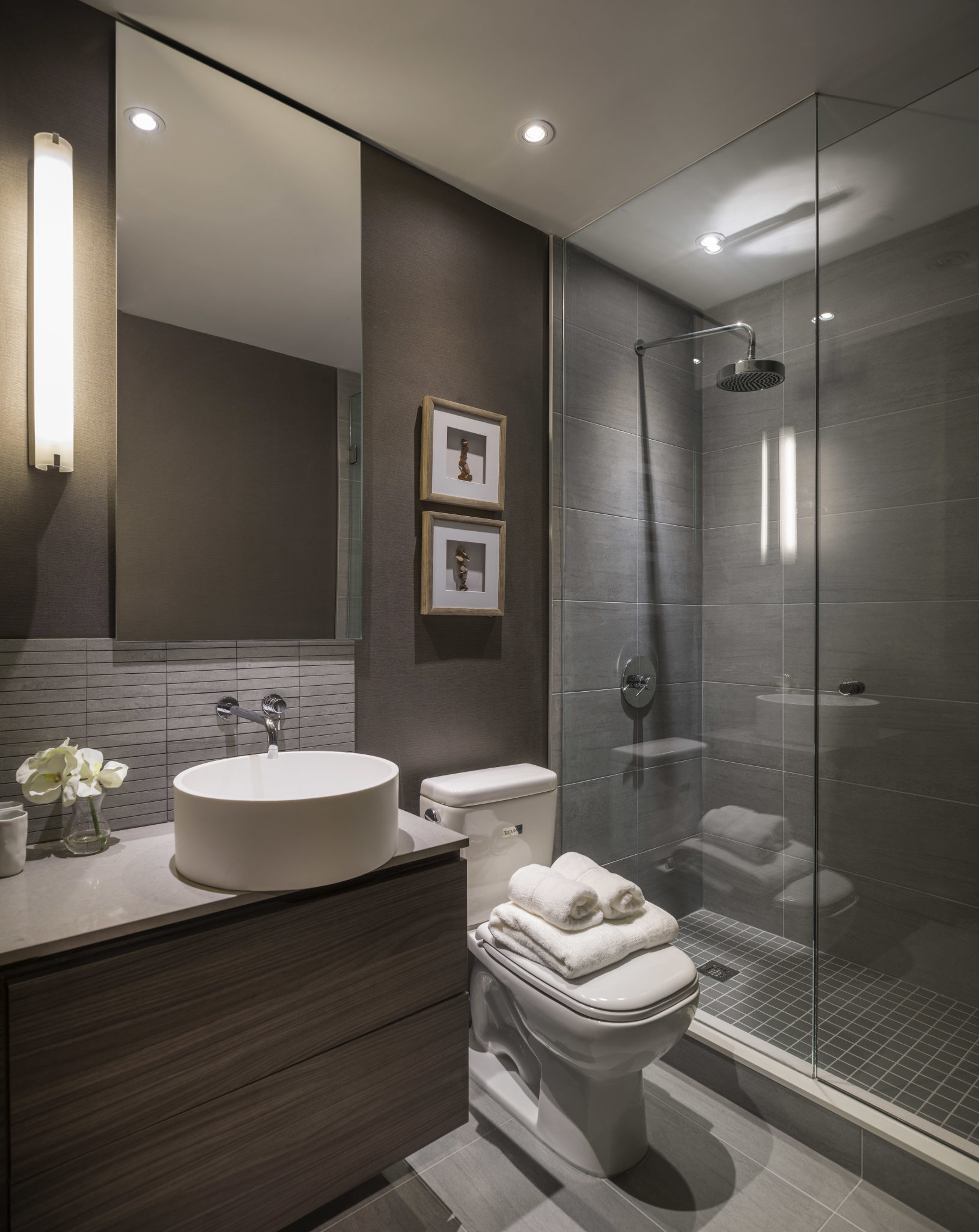 The concept of the model suite is to envision a “lifestyle of collection” – despite the suite’s compact dimensions – facilitated by custom millwork details to hold wine, books, artifacts, photographs and workspaces. The suite is enveloped in rich, luxurious textures and warm, earthly tones supporting the notion of an elegant retreat for the 24 hour lifestyle.