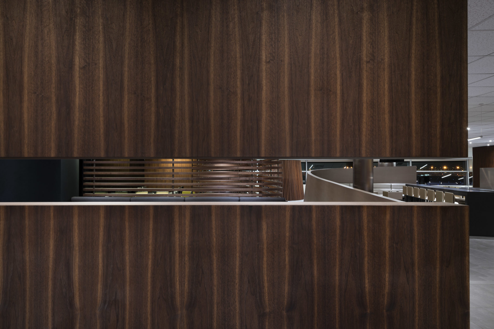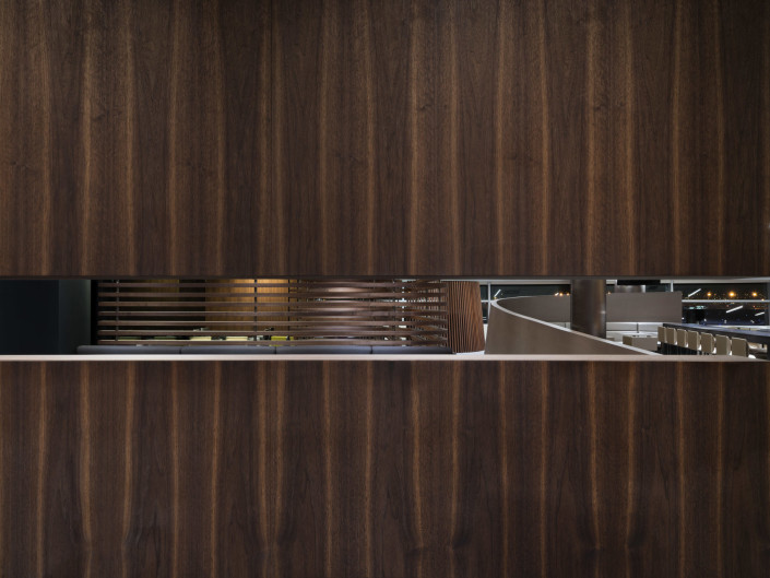 The concept was to blend flowing forms evocative of flight and air currents within a space enveloped in warm wood and metallic finishes reminiscent of vintage airplanes. The result is a space that is functional, compelling and beautiful with a universal and timeless appeal – a memorable space intended to inspire brand loyalty. A curved reception desk greets and leads the traveler into the main circulation spine articulated by a sculptural partition, which is flanked by a variety of seating areas – short, intermediate and long term – from