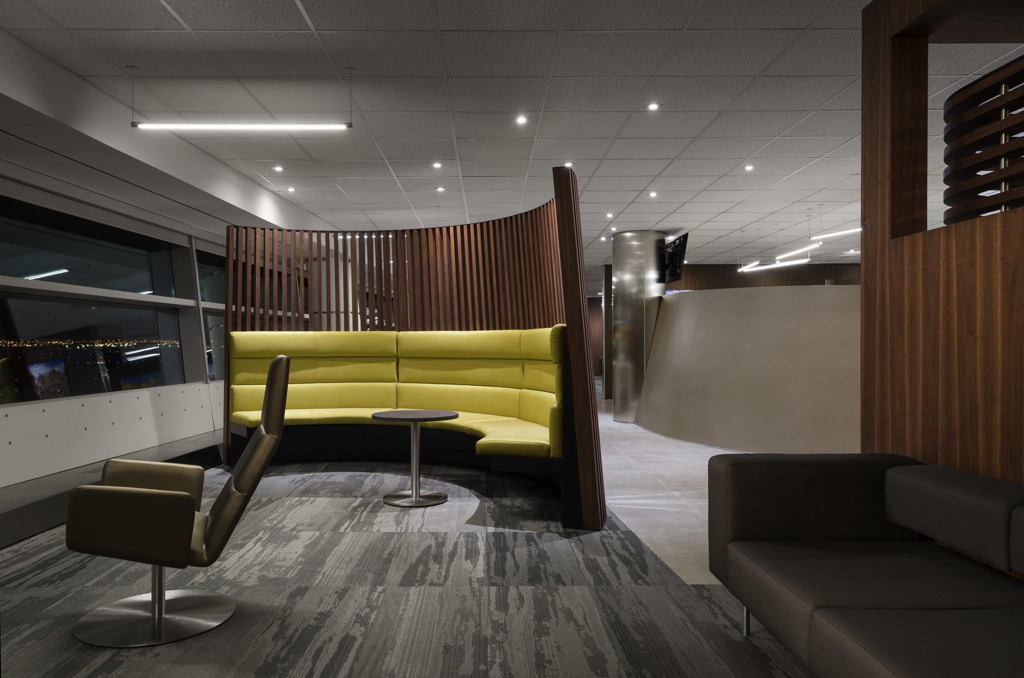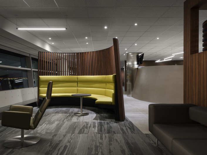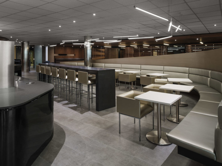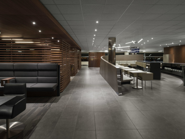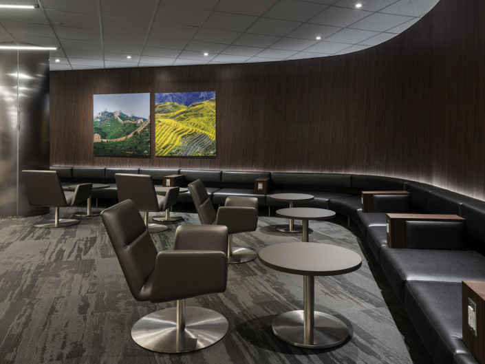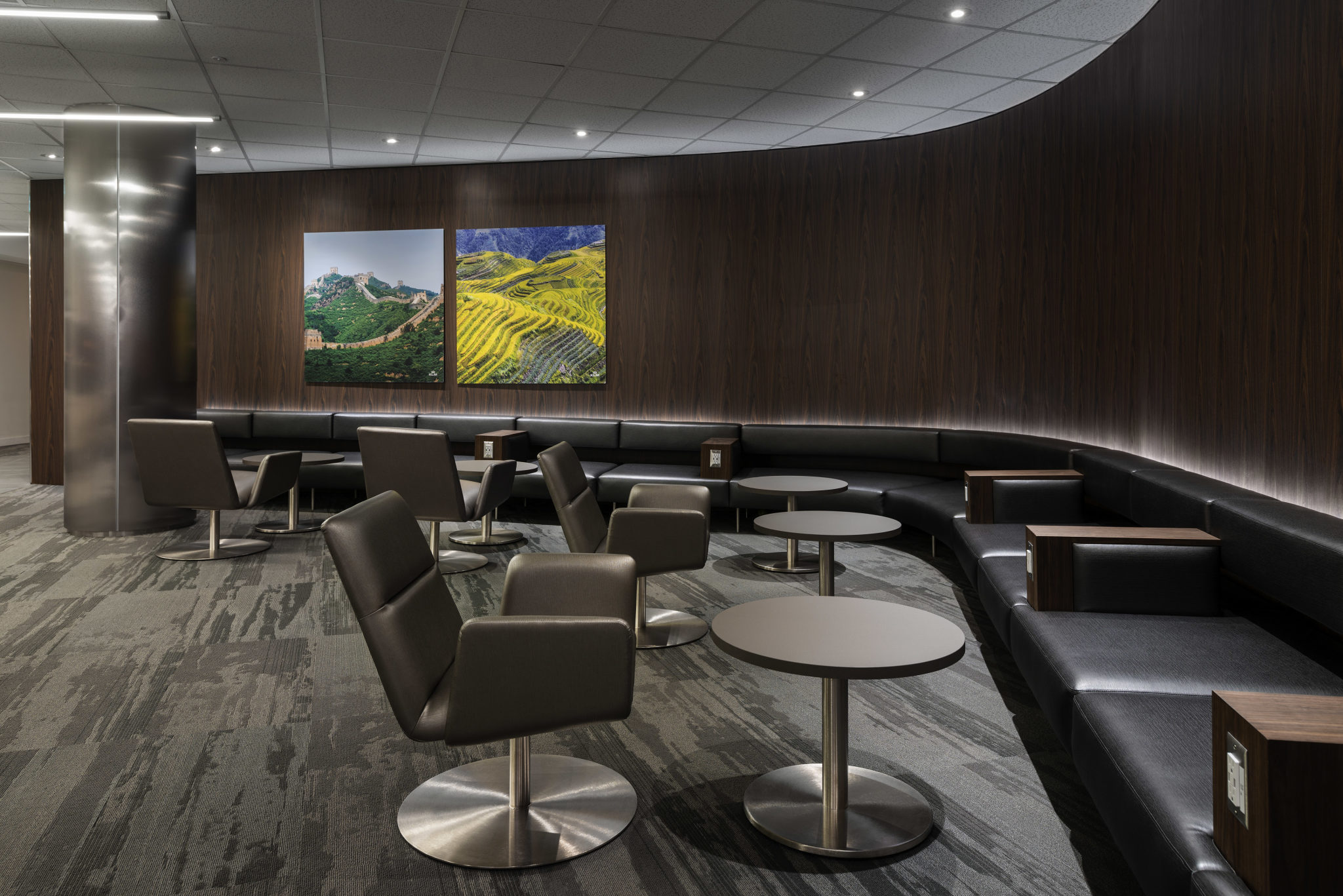 dining, lounging and work space, to private and family or group areas. All seating areas feature charging capabilities. The servery/dining area functions as the central “square” or hub from which one can disperse into the quiet or intimate areas. The strategy was to create clear and intuitive areas of movement and levels of repose, utilizing flowing forms evocative of flight to subtly direct one through the lounge where one will discover vignettes offering a variety of choices in seating types.