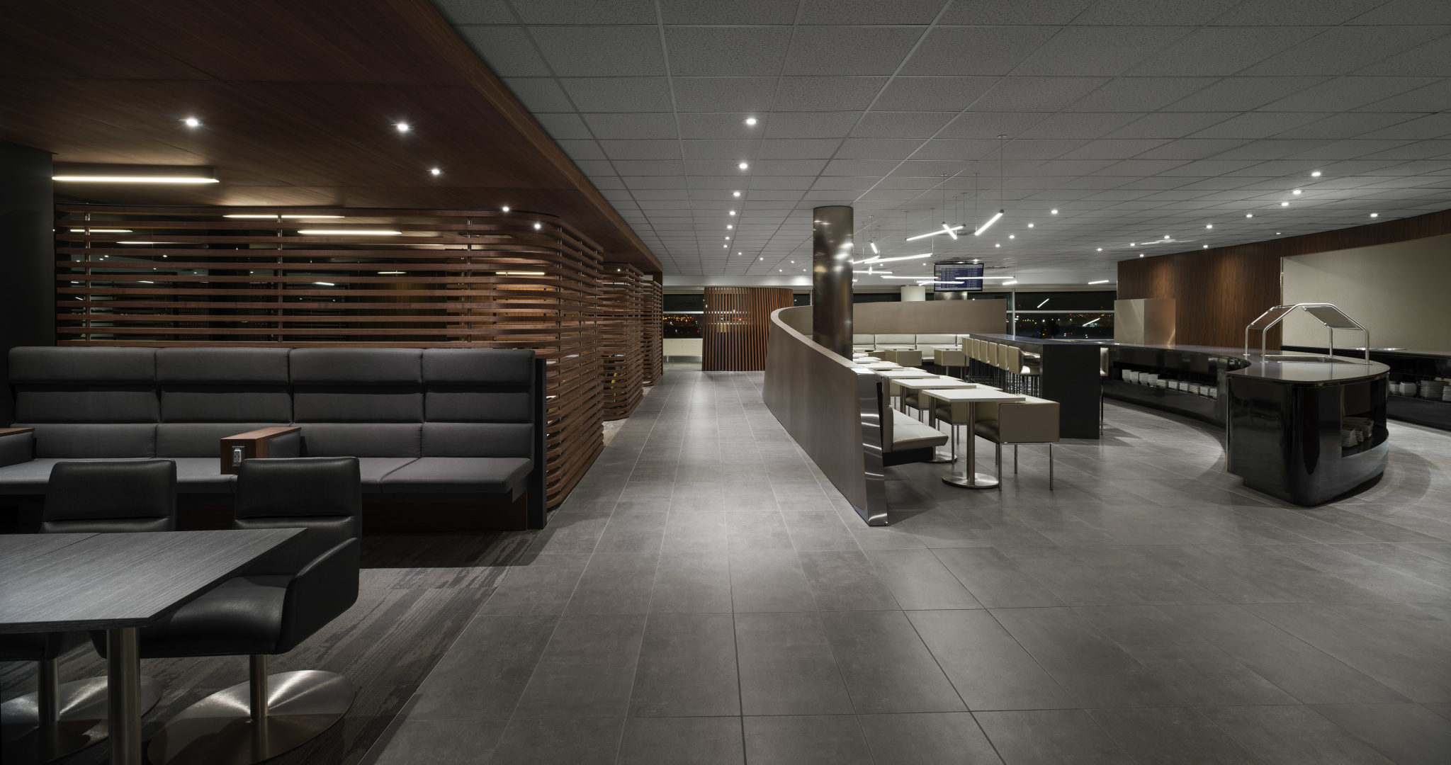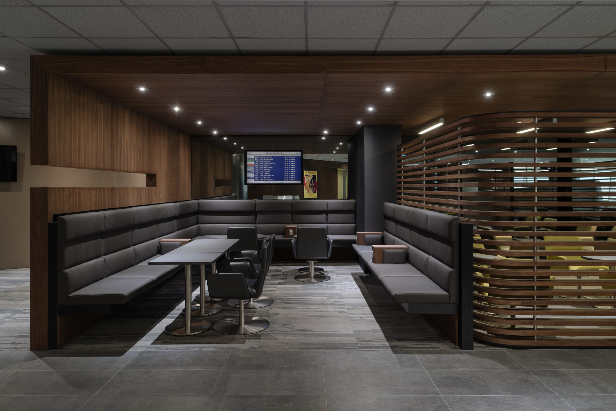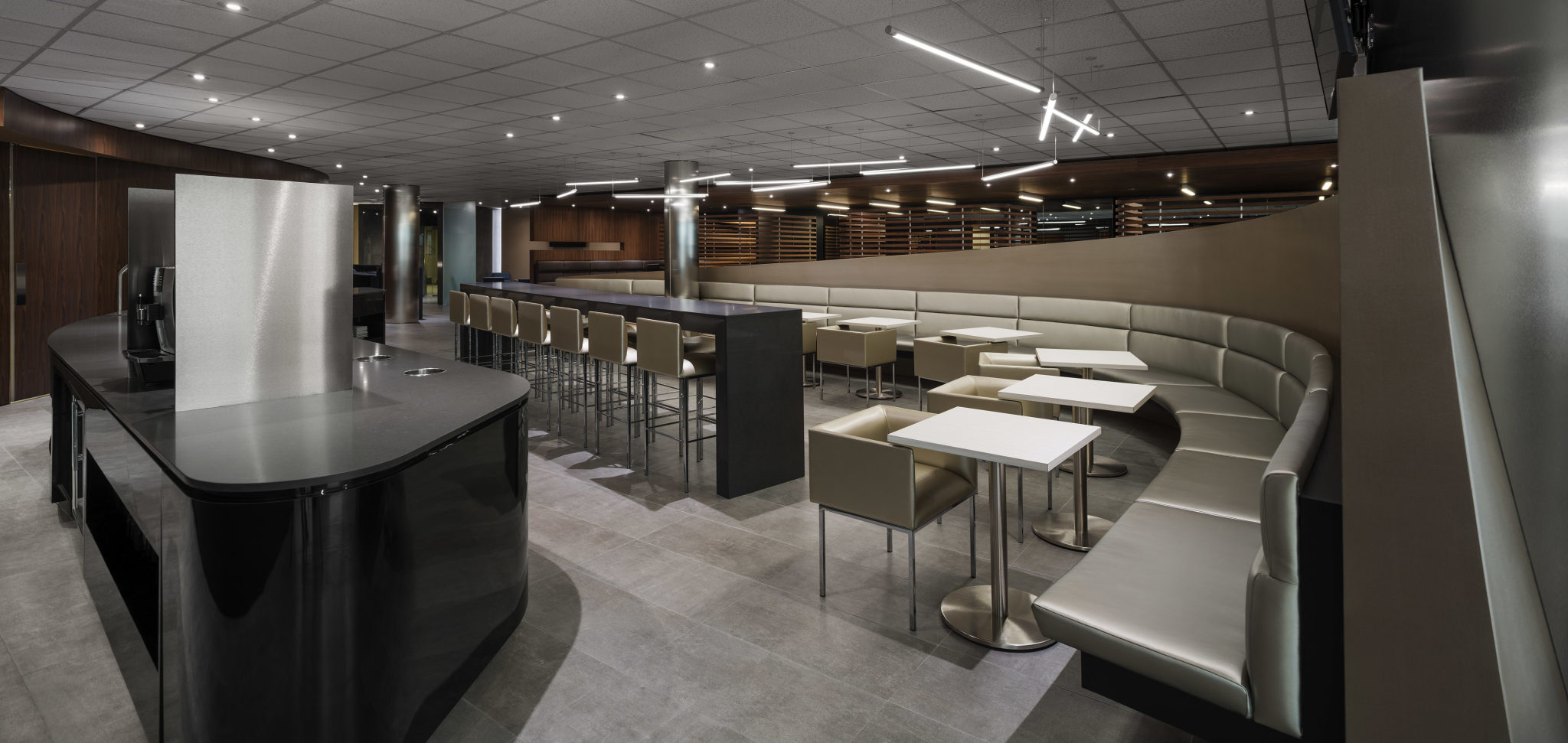 dining, lounging and work space, to private and family or group areas. All seating areas feature charging capabilities. The servery/dining area functions as the central “square” or hub from which one can disperse into the quiet or intimate areas. The strategy was to create clear and intuitive areas of movement and levels of repose, utilizing flowing forms evocative of flight to subtly direct one through the lounge where one will discover vignettes offering a variety of choices in seating types.