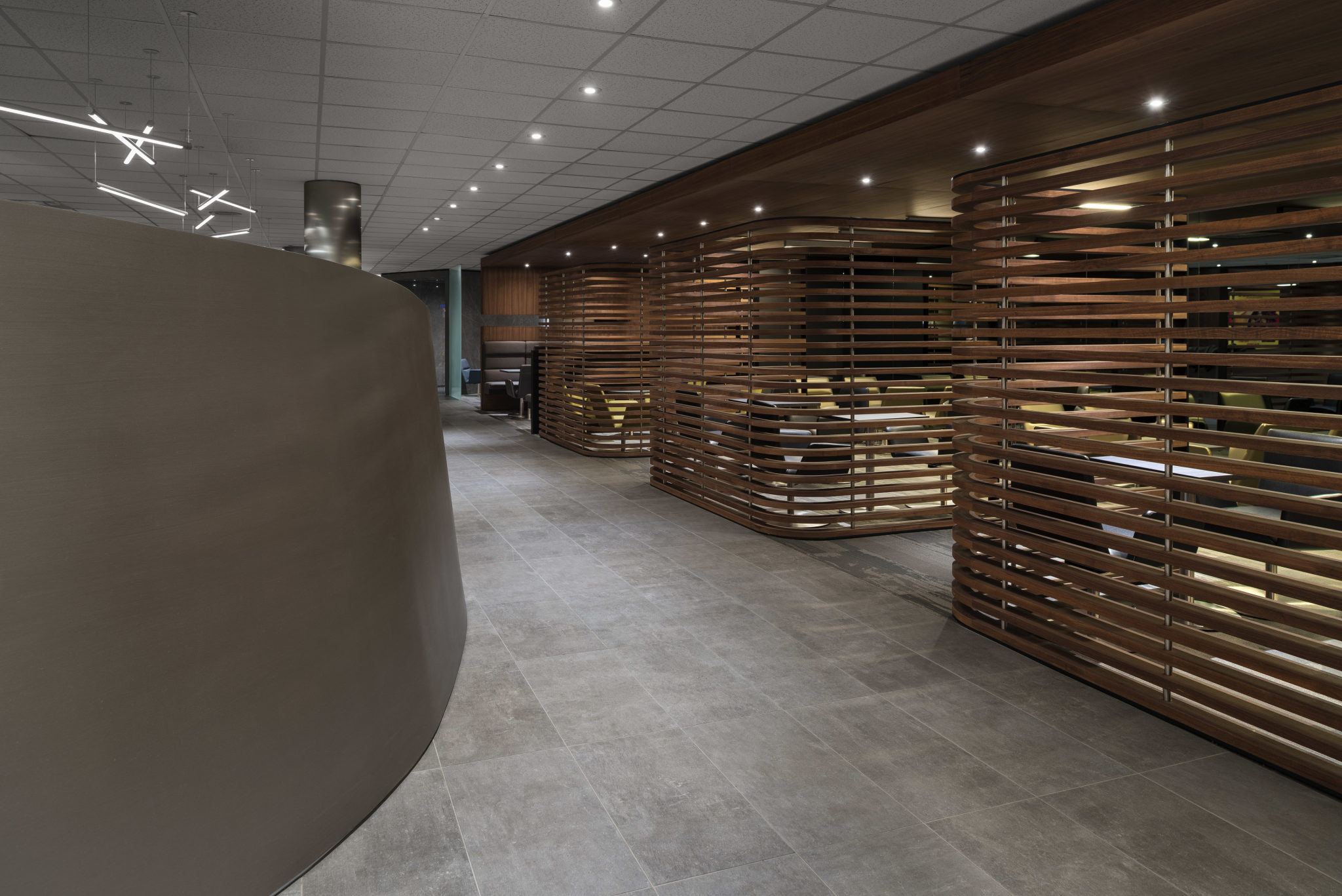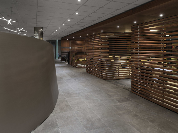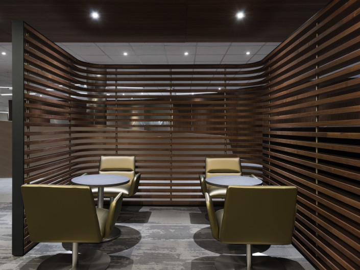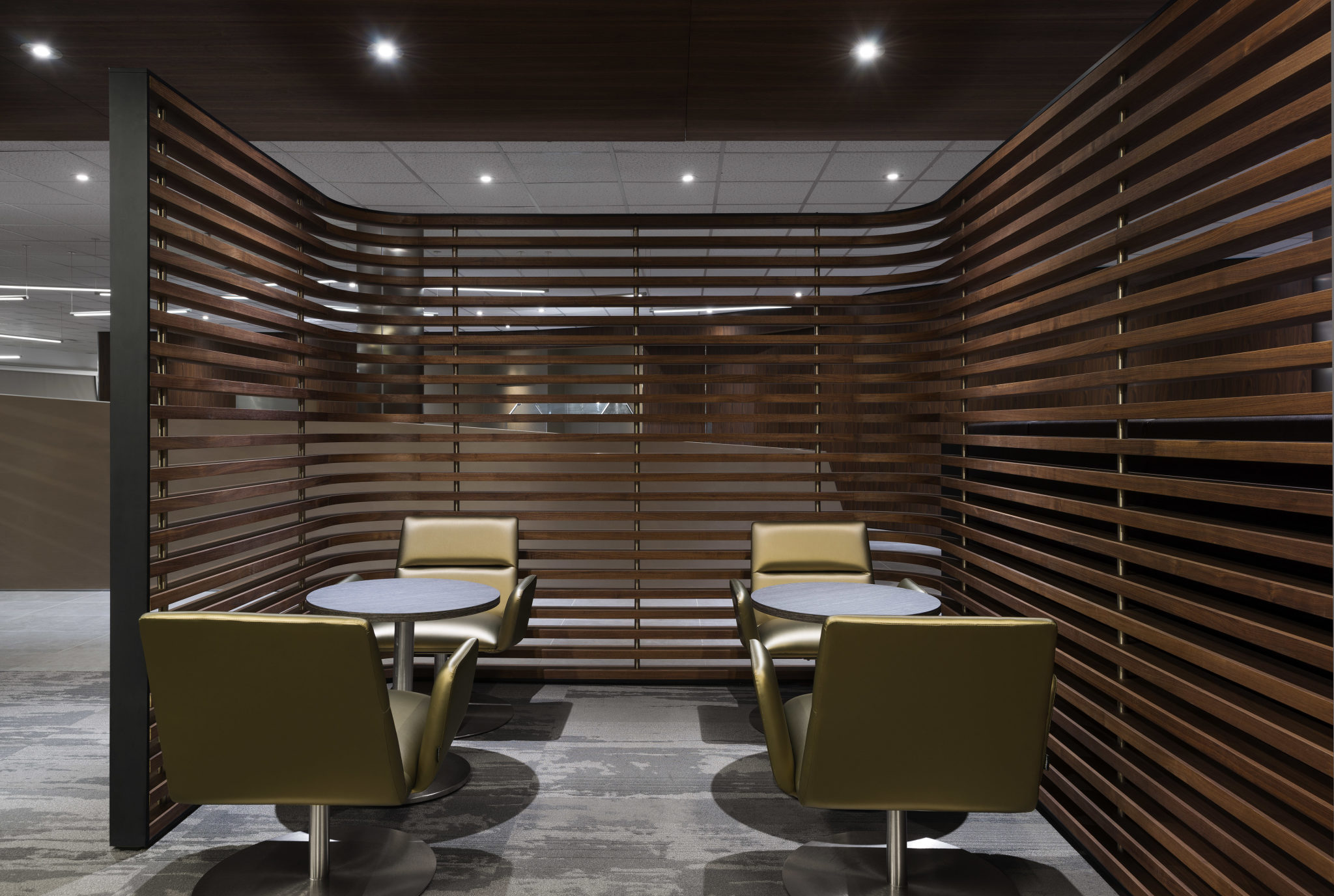 The use of metallic finishes – including the furniture upholstery and the metal finish of the columns – is balanced with curved screens in walnut veneer that create seating vignettes and privacy.