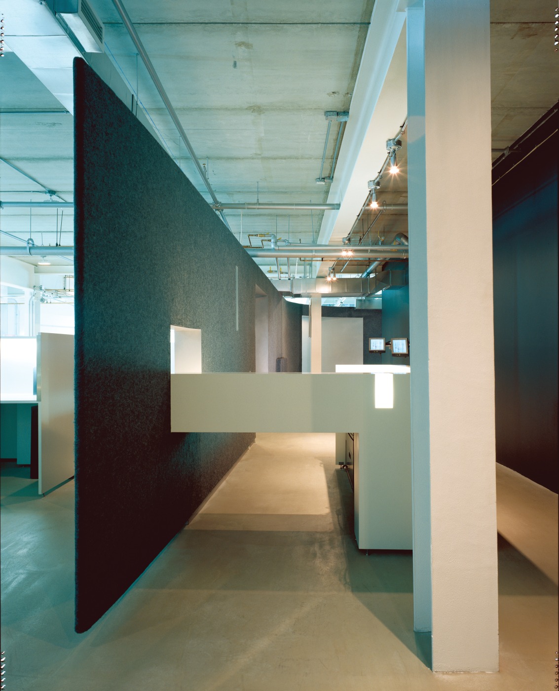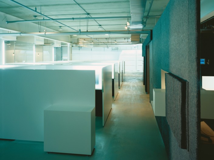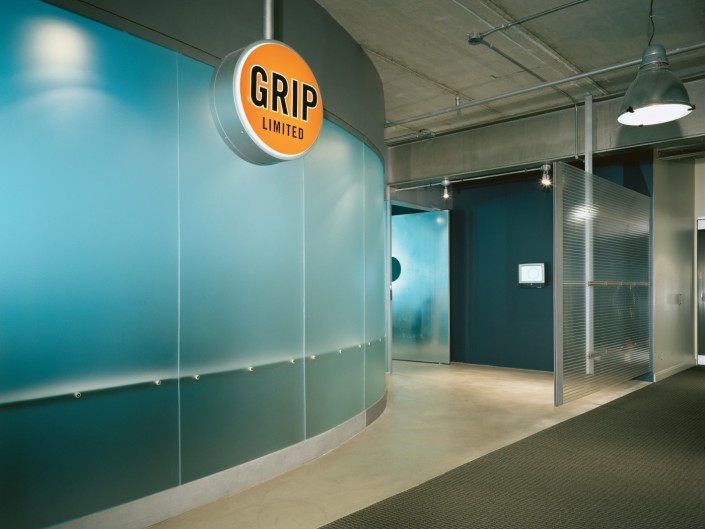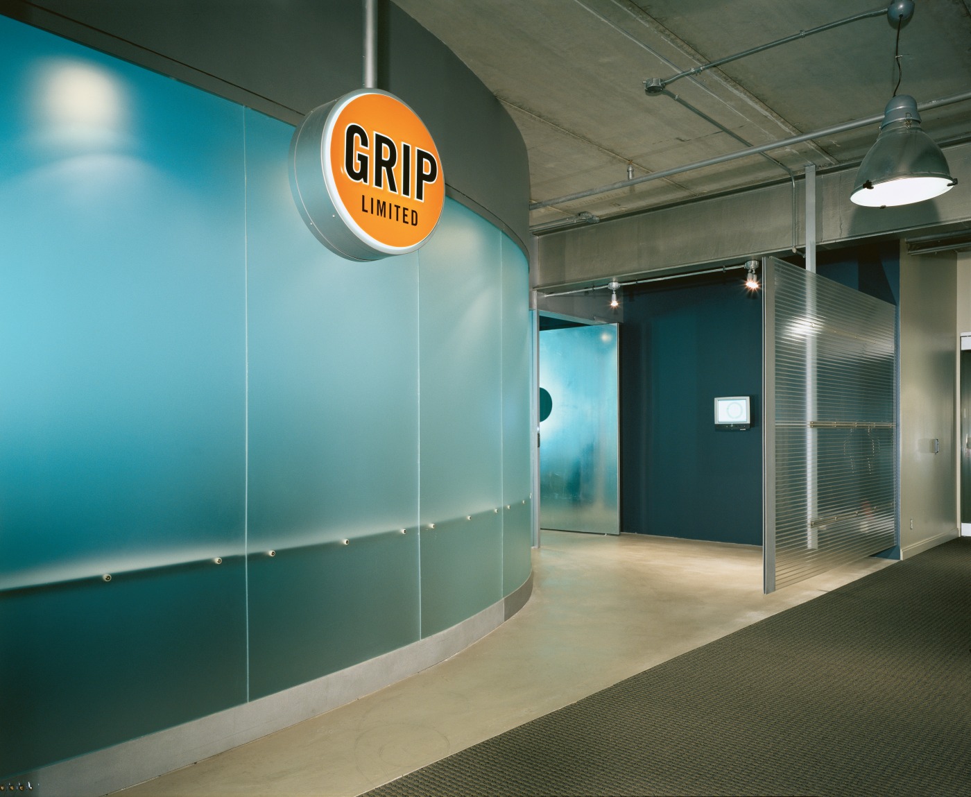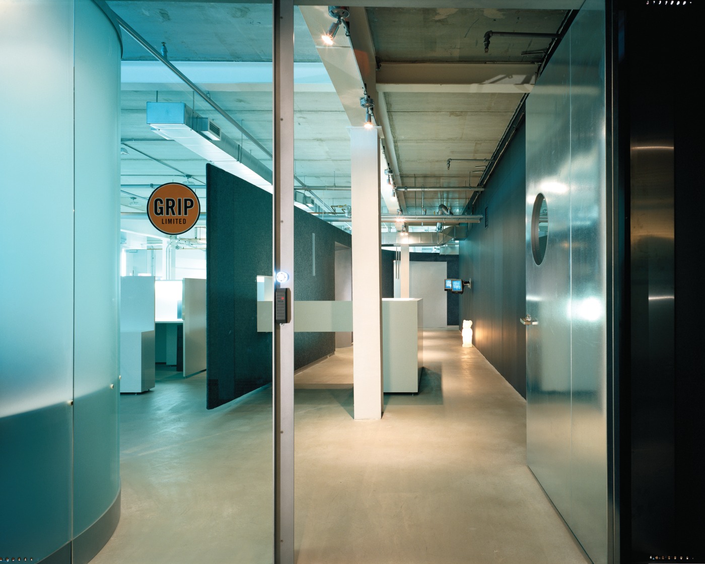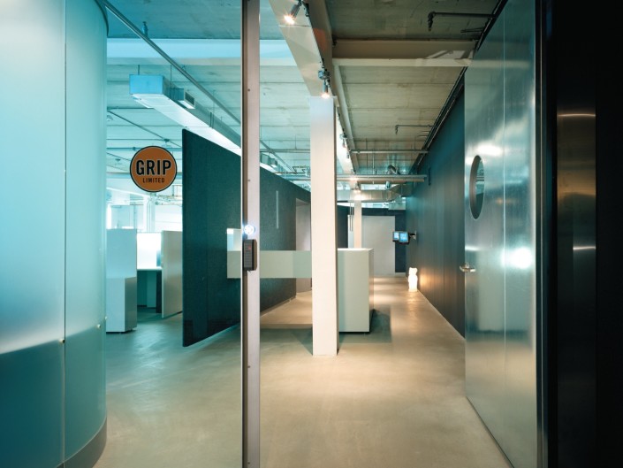 “Felt Wall” activated and linked by movement – a cinematic promenade. For Grip, the Narrative is intended to evoke – on a subconscious level – both their industry (through a heightened sense of materials and objects) and by paralleling Grip’s working methodology (engaging their clients in the creative process by revealing it). The “tableaus”, are freestanding programmatic spaces imbued with details within that inflect the space to engage the viewer. These details or “moments” are architectural interpretations of “wit”, requested by and analogous of the Client’s own work. The narrative, manifested in the form of the “Felt Wall” has multiple roles; it articulates a promenade that leads one through the space, serves to absorb sound and functions as a physical barrier to define the public and private zones of the Agency.