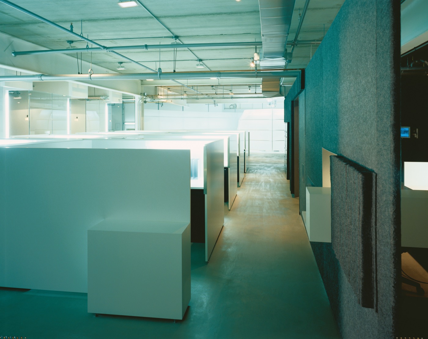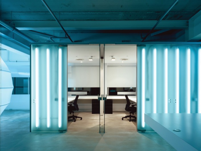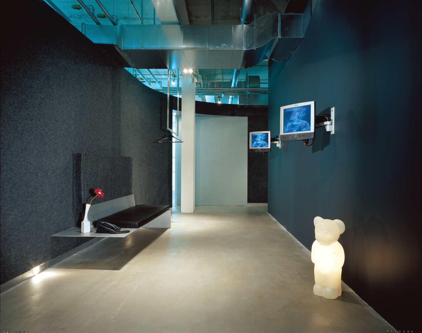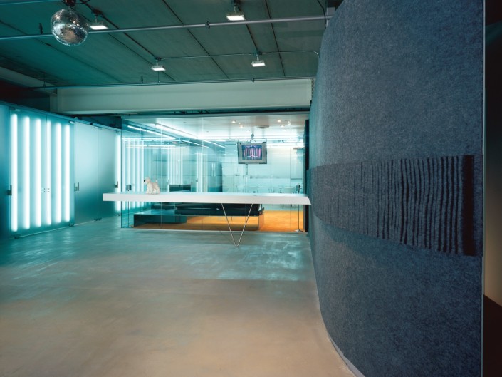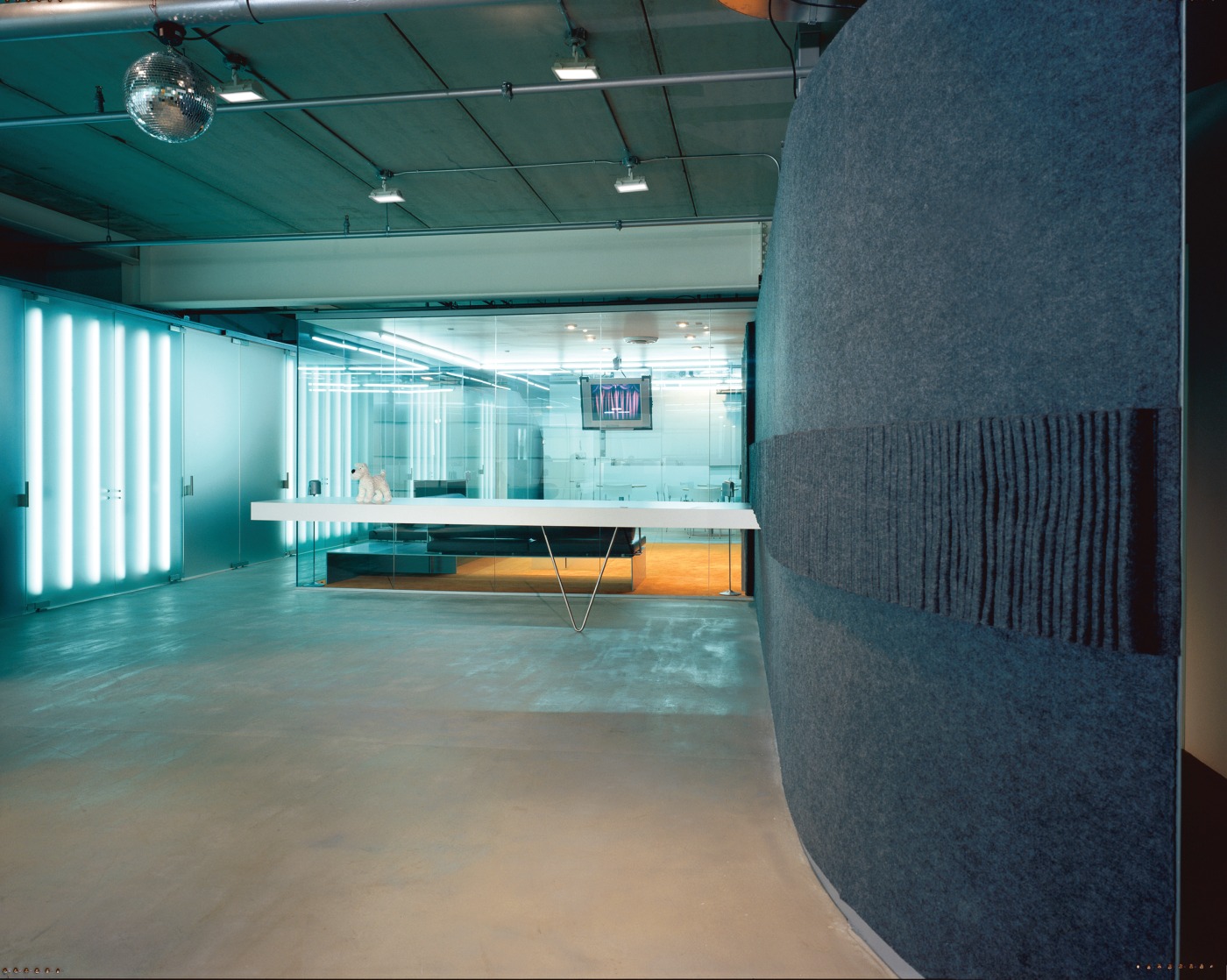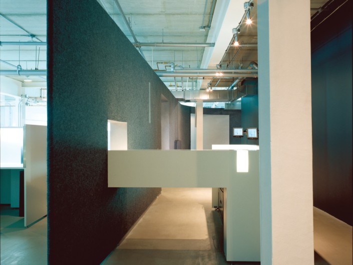 “Felt Wall” activated and linked by movement – a cinematic promenade. For Grip, the Narrative is intended to evoke – on a subconscious level – both their industry (through a heightened sense of materials and objects) and by paralleling Grip’s working methodology (engaging their clients in the creative process by revealing it). The “tableaus”, are freestanding programmatic spaces imbued with details within that inflect the space to engage the viewer. These details or “moments” are architectural interpretations of “wit”, requested by and analogous of the Client’s own work. The narrative, manifested in the form of the “Felt Wall” has multiple roles; it articulates a promenade that leads one through the space, serves to absorb sound and functions as a physical barrier to define the public and private zones of the Agency.