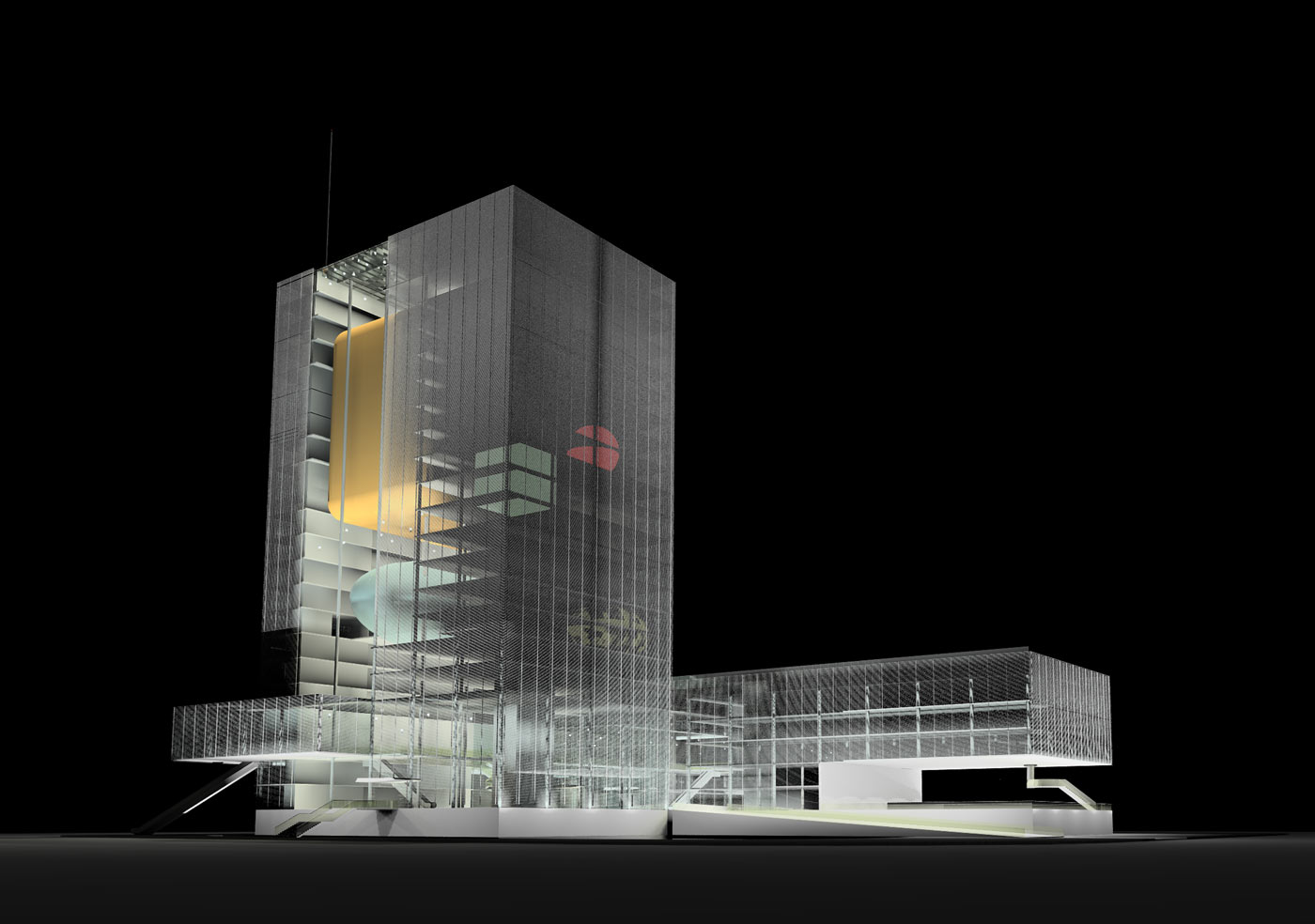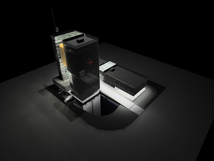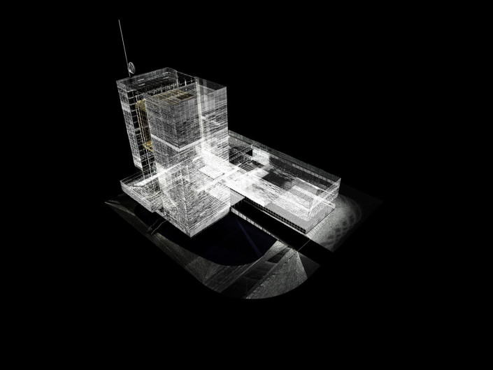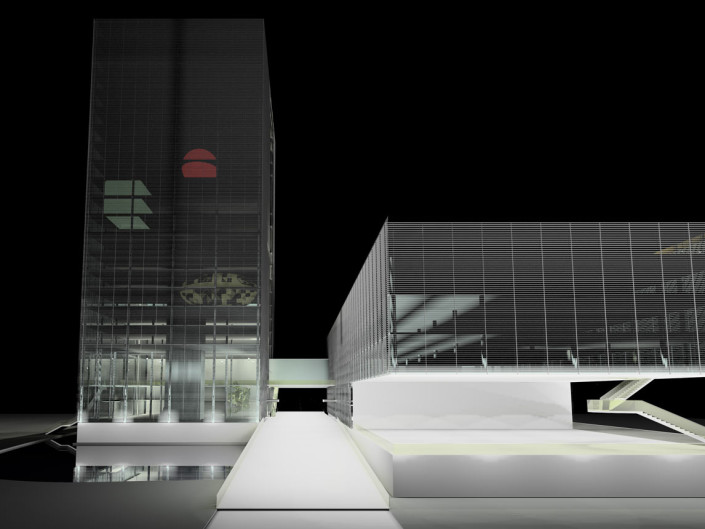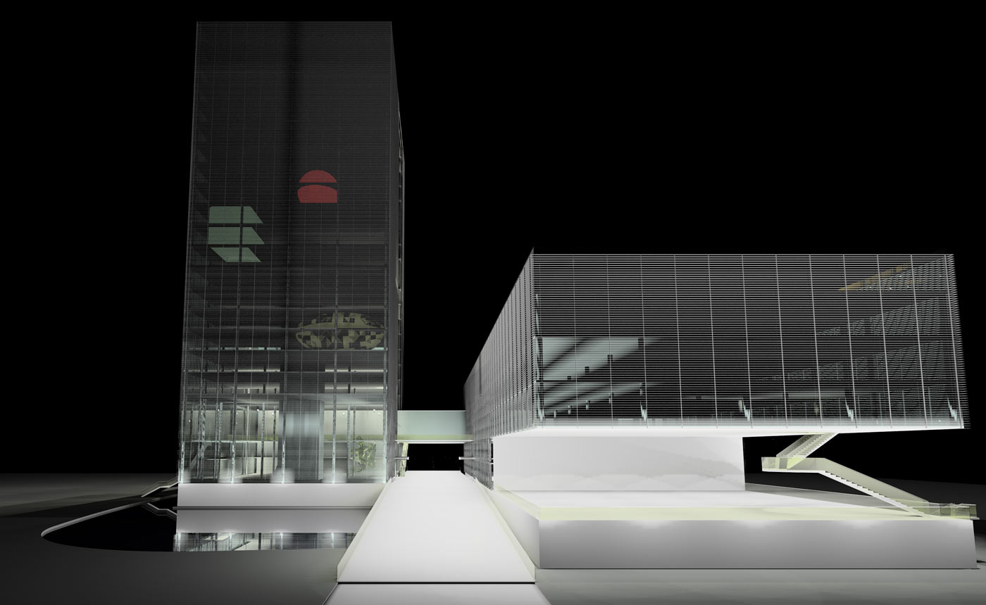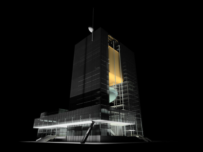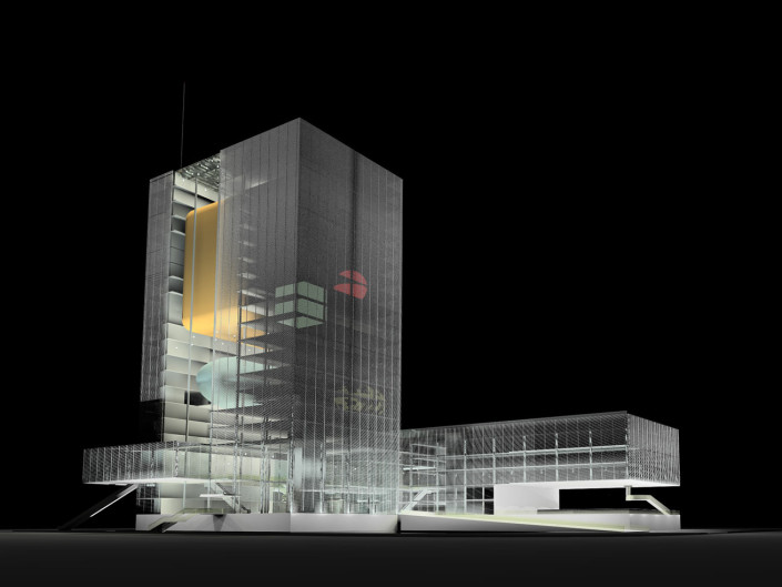 the functions that occur within. The building must not only transform and adapt to its varied needs, but also be a vessel and conveyor of image and information. Therefore the building itself becomes a metaphorical television: both a “projector” and “screen”.