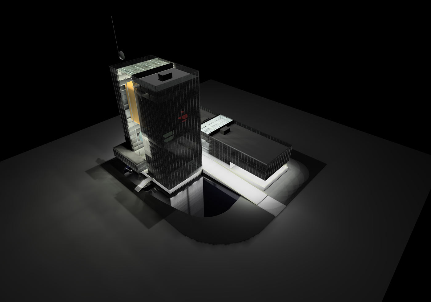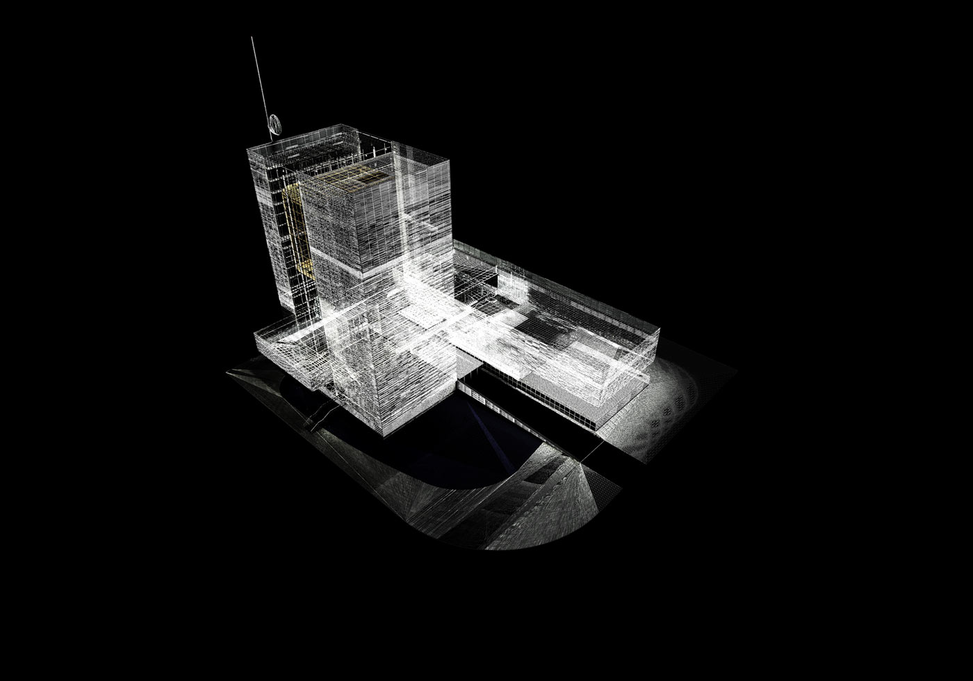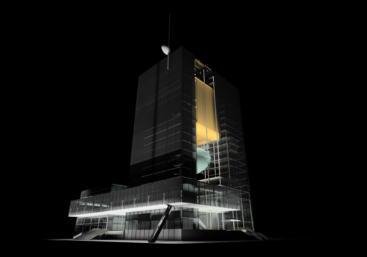 the functions that occur within. The building must not only transform and adapt to its varied needs, but also be a vessel and conveyor of image and information. Therefore the building itself becomes a metaphorical television: both a “projector” and “screen”.