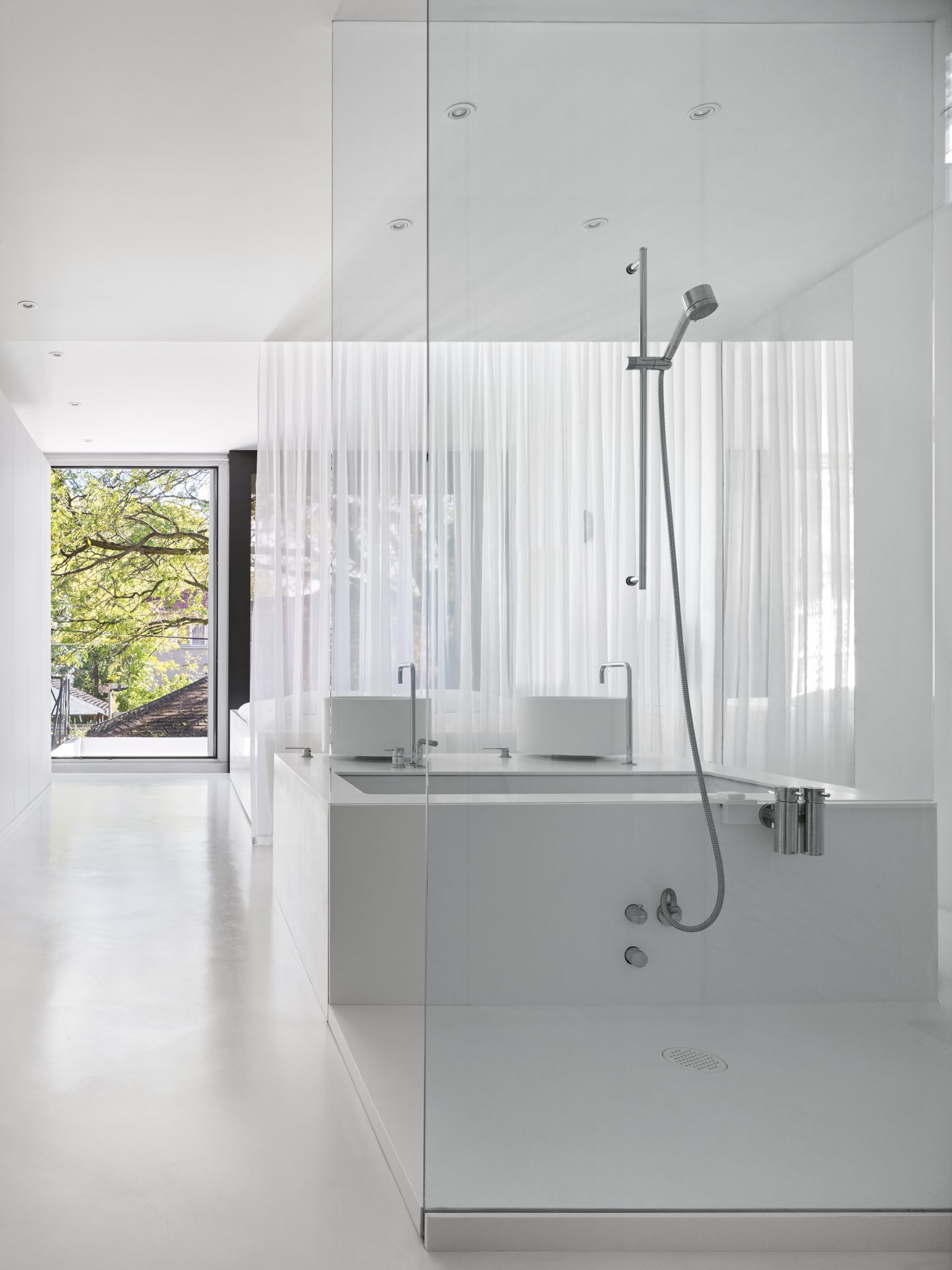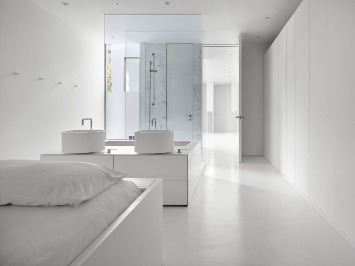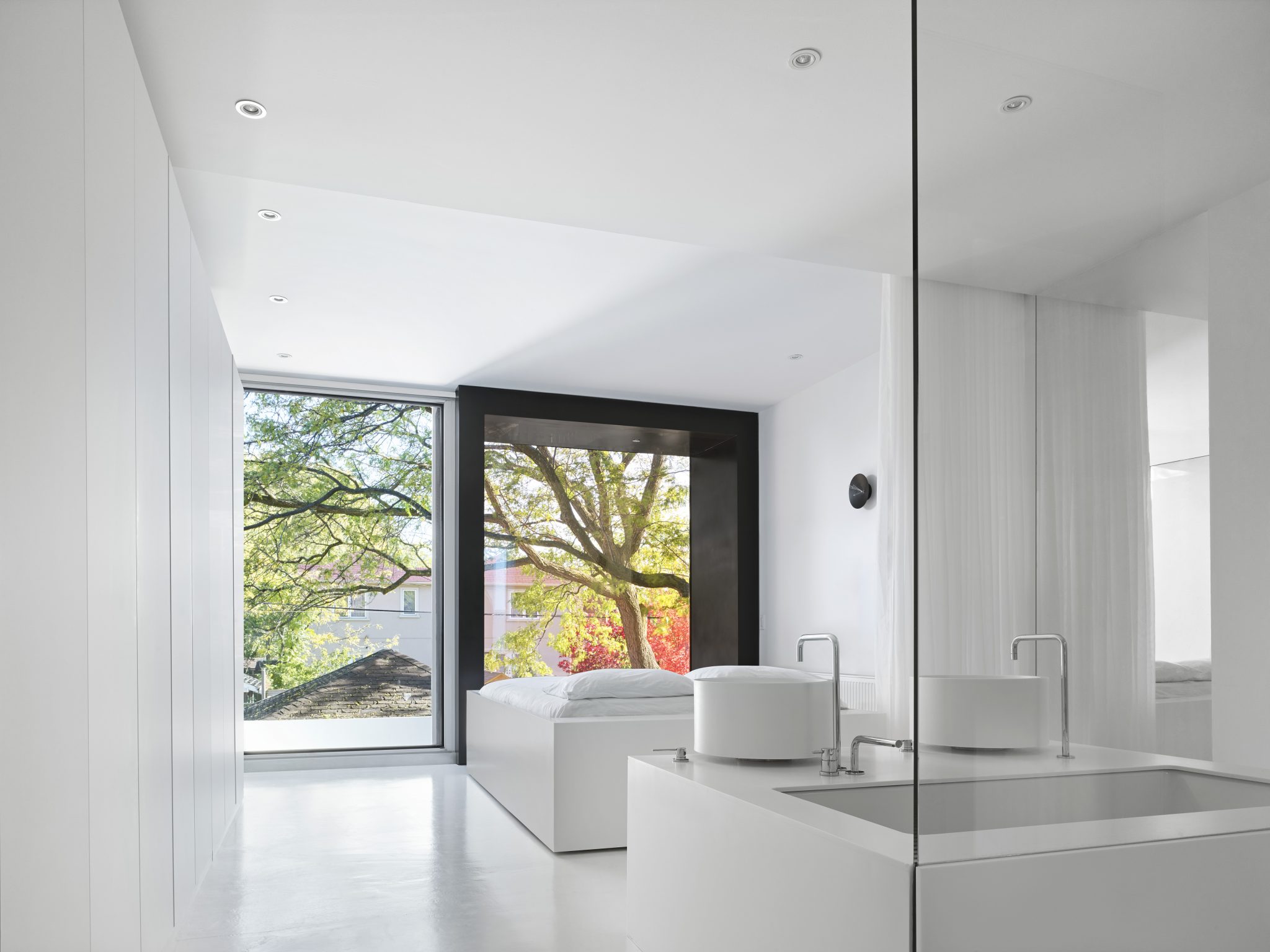 The second floor features a bridge spanning over the Dining Room linking the Master Bedroom and a second Bedroom and Bathroom. Within the Master Bedroom, rather than having an enclosed ensuite resulting in a separate, smaller bedroom, the ensuite is opened to gain light and view, and components of the bathroom become sculptural objects. Vessel sinks appear as totemic elements, the shower is screened with overlapping layers of glass viewed as one enters the room. The monolithic base of the vanities provide storage and contain a whirlpool bath insert. It is also consistent in form to the custom bedframe. A black-framed 3’ cantilevered seating alcove offers repose, and the bedroom can be modulated for view and privacy. For example, bed and bath areas are separated by a sheer curtain, open and drawn when desired and folding doors can be opened to reveal a Juliette balcony.
