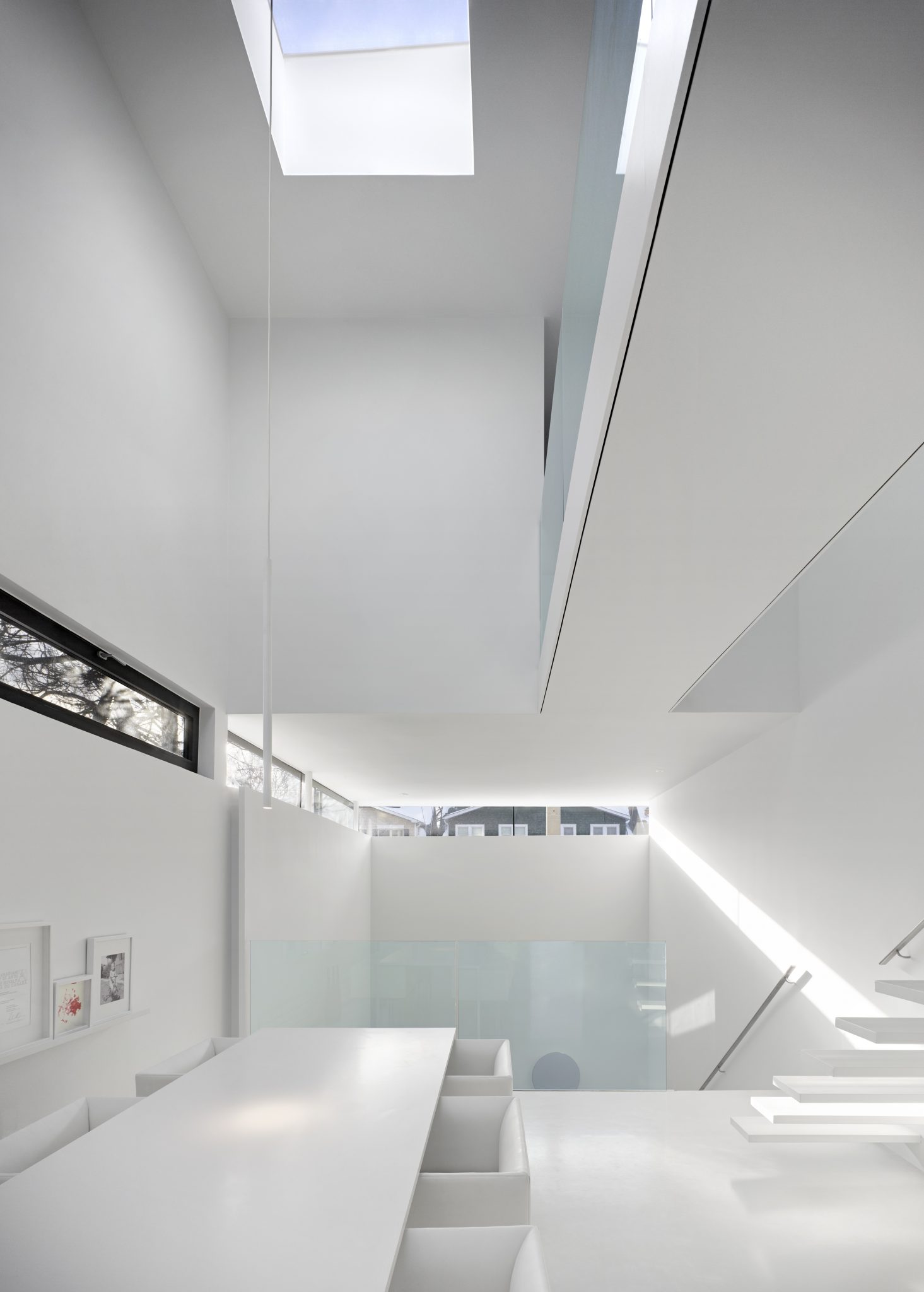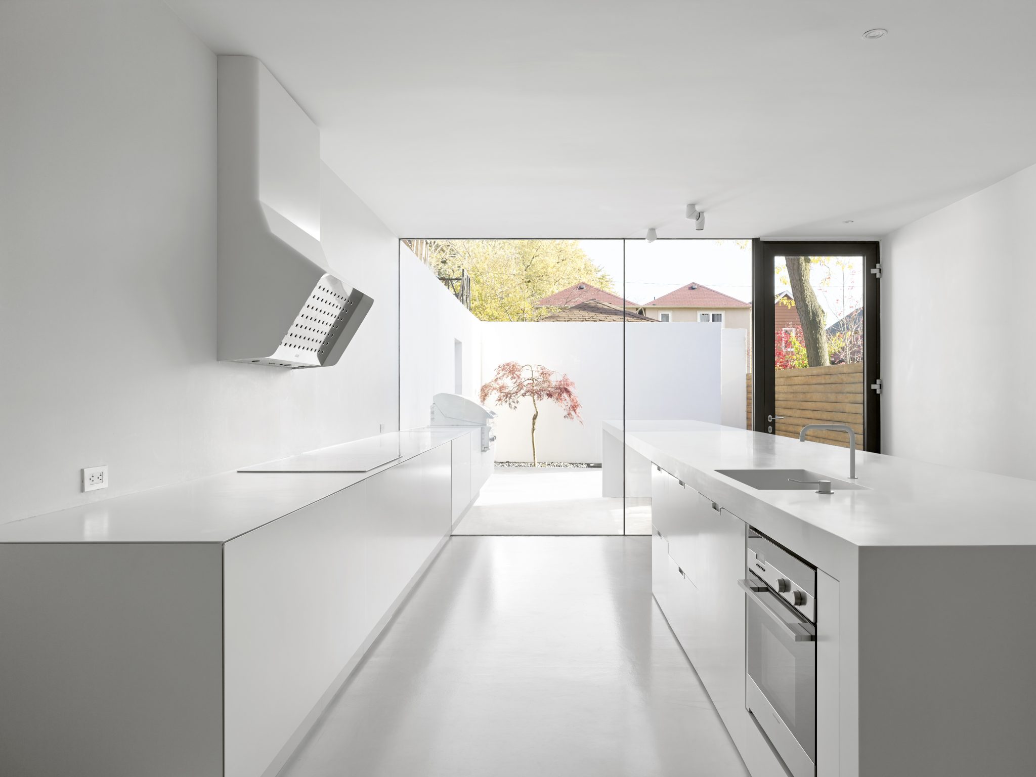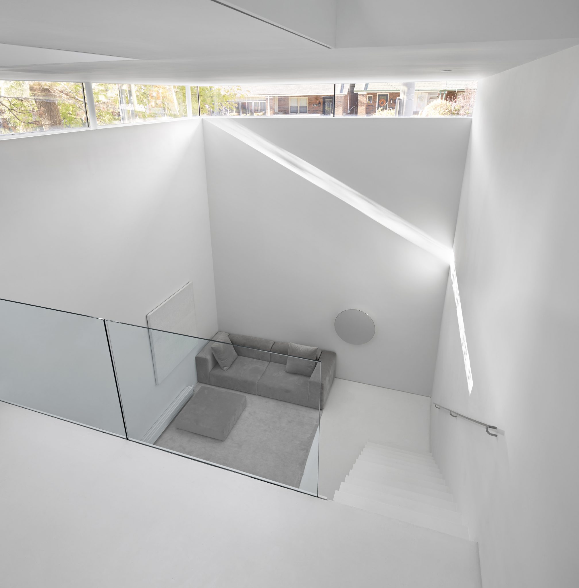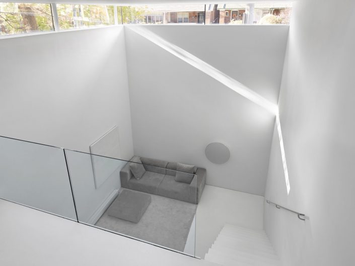 Located in the Upper Beaches area of Toronto, the residence faces a busy, at times cacophonous arterial road and as a result the exterior openings were minimized to a single horizontal strip window. Entrance into the residence is at the midpoint of the building accessed through a side lane. The entrance foyer is located between the Dining and Kitchen/Breakfast areas. The east-west orientation of the building allows for morning light at breakfast and evening light at dinner. From the one-storey kitchen, the dining room is double-height and the living room is triple-height, invoking a sense of expansion or compression as one flows through the home.