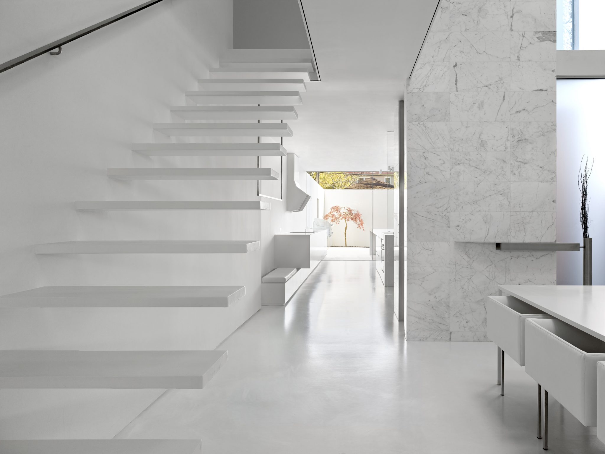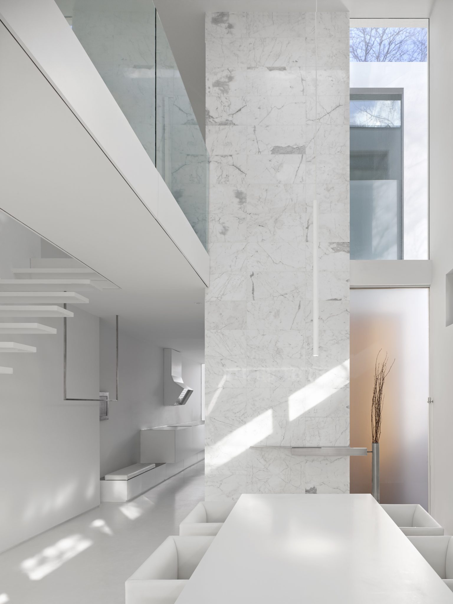 The double-height Dining Room is enclosed by a Powder Room clad in statuario marble tiles, a second floor bridge, a flights of stairs and overlooks the triple-height Living Room.