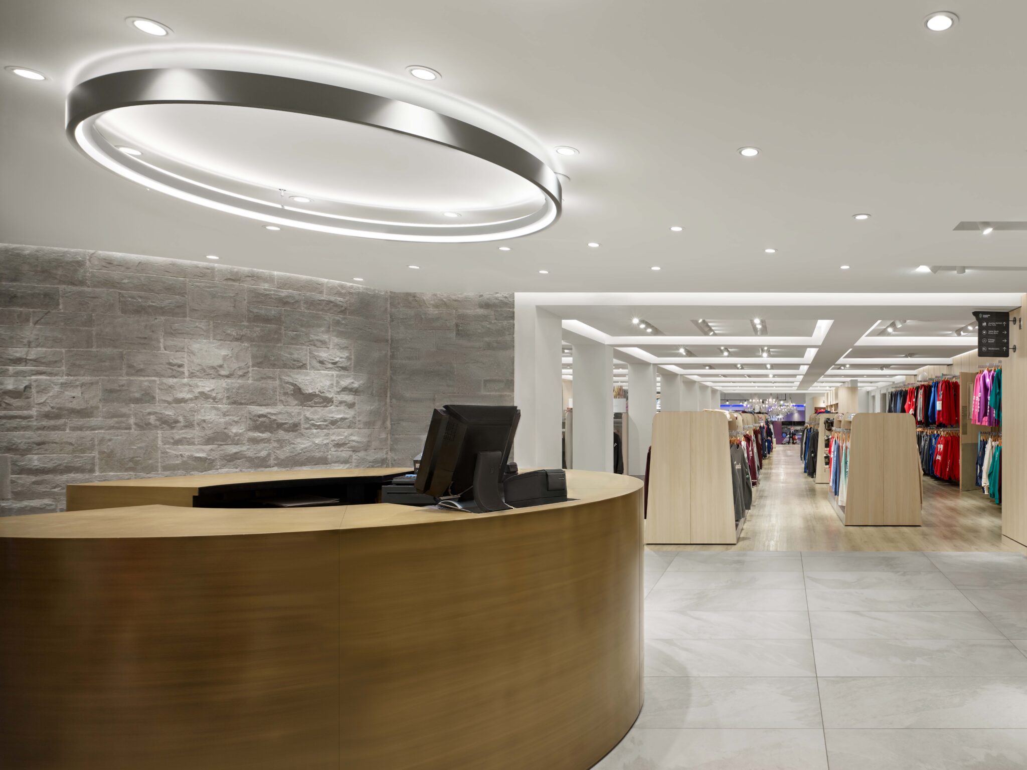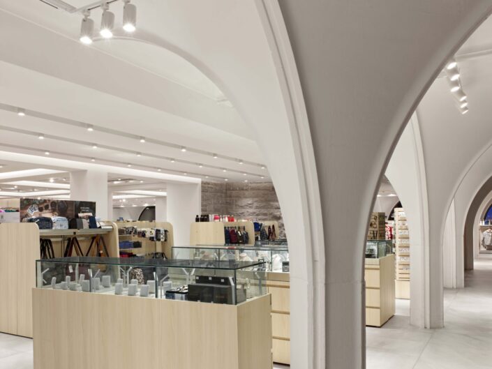 The redesigned Table Rock House Shop references the building’s heritage, reinterpreting the historic Table Rock House built in 1925, with additions built in the 1960’s and 1980’s. The interior is designed to peel away and reveal elements of the original House and selectively featuring its subsequent additions. The original stone turrets are revealed and the coved ceilings and grid-like configuration of the original beams and columns are recreated, enhanced with accent lighting. The retail display fixtures are custom designed and are multi-functional, their forms and details inspired by an agrarian past and present and configured to enhance movement and view. A priority in the design of the store fixtures was to develop a consistent language able to assimilate the wide-ranging product sizes and types; a strategy of seeking balance between featuring products and reducing visual clutter.