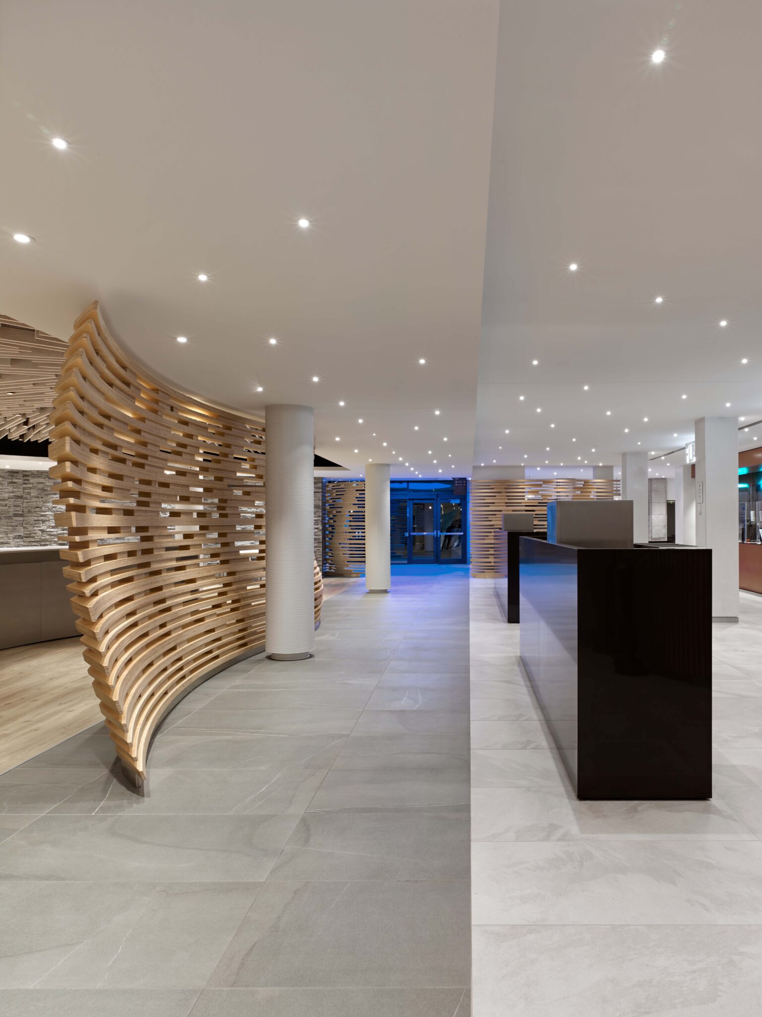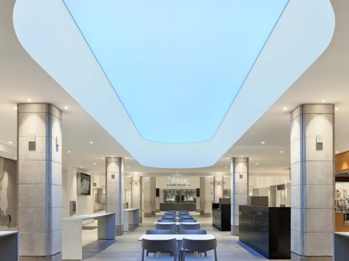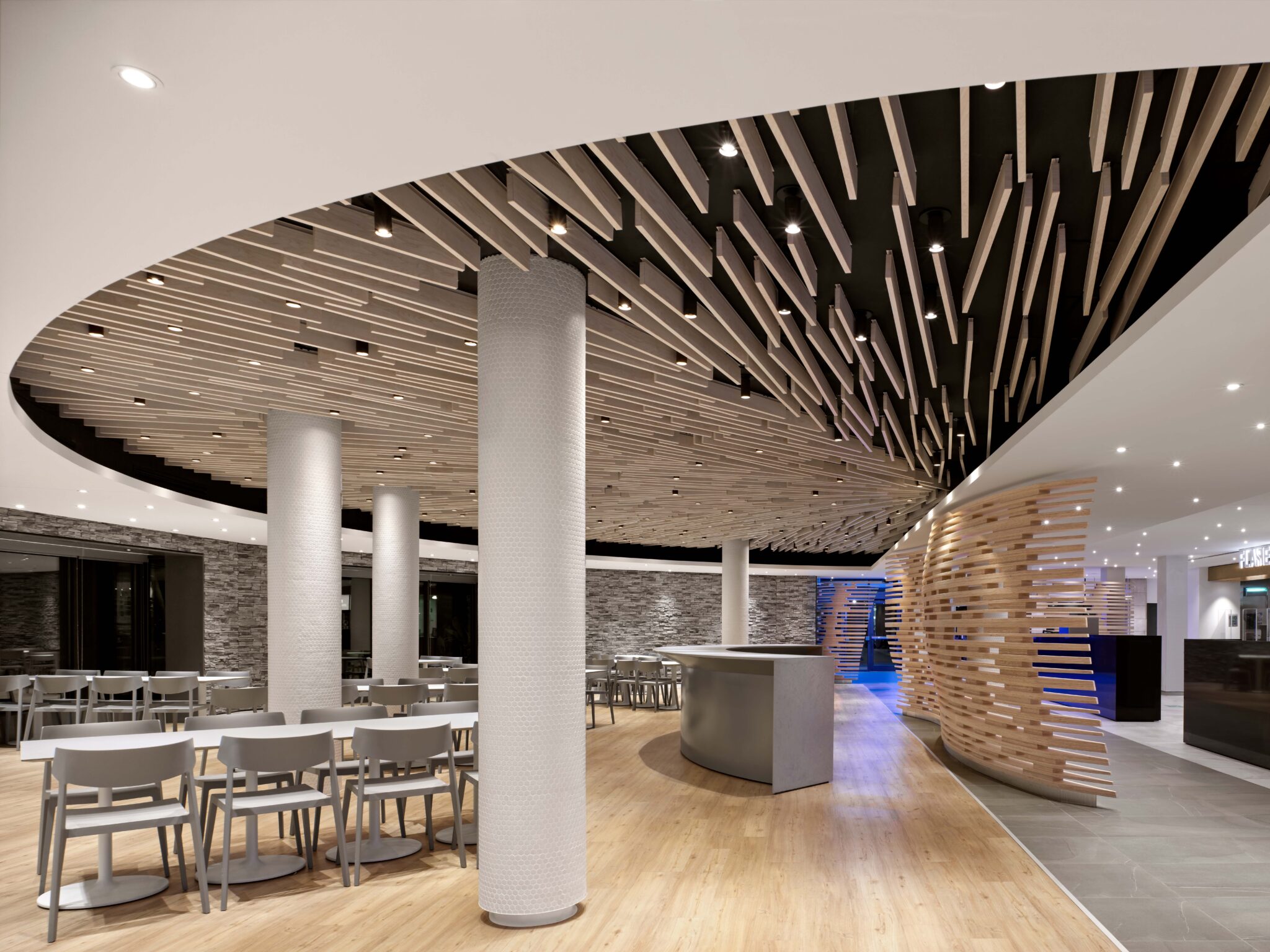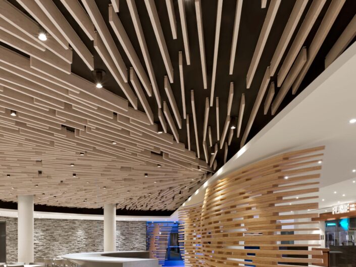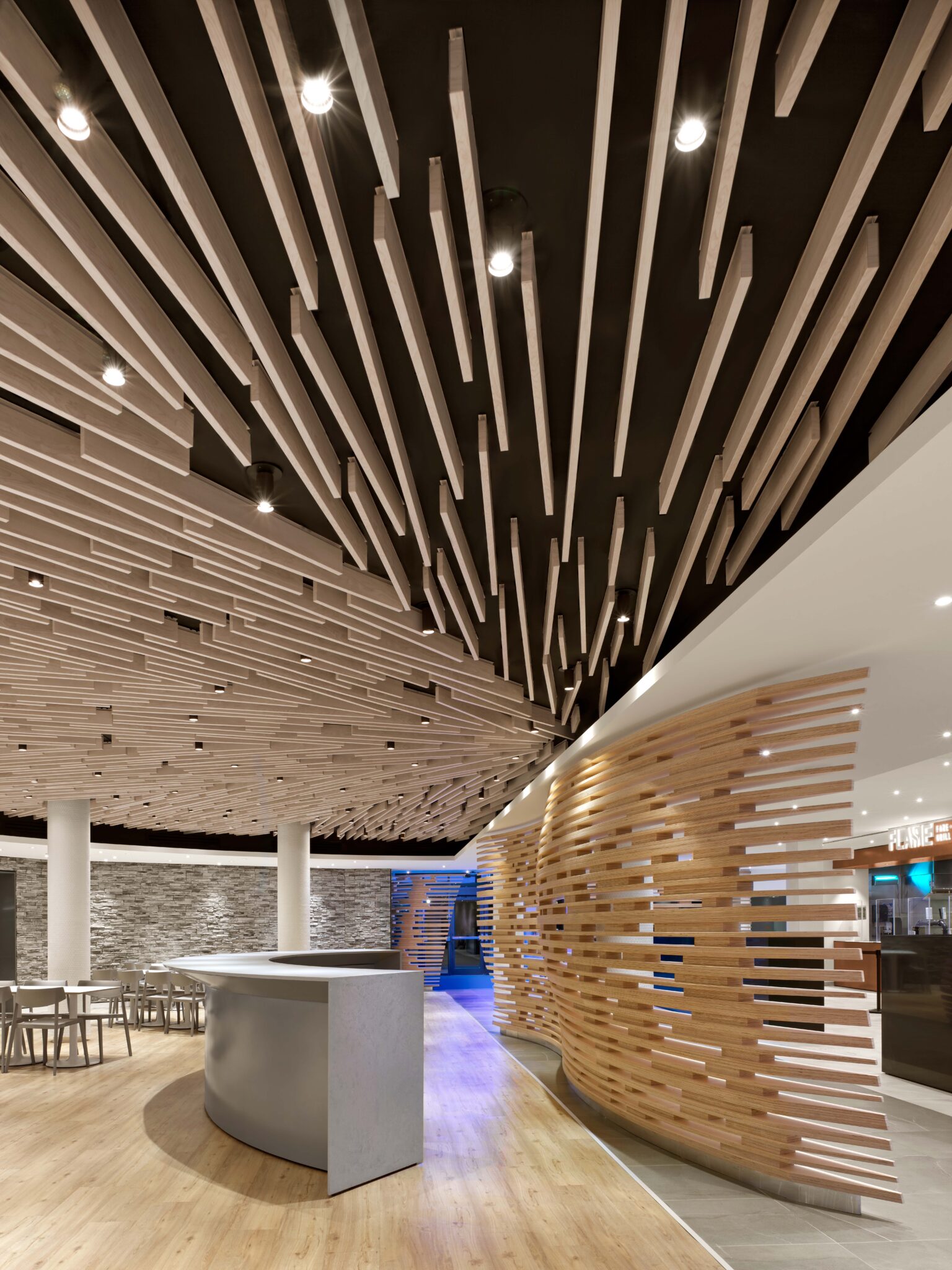 The Table Rock Market on Level 1, is comprised of fast casual restaurants with associated open dining areas, including pizza, sushi and ice cream providers all developed by the client group. The design created a consistent aesthetic to suggest a unifying brand of the Centre, and motifs such as copper counters, shared finishes with unique details help define each restaurant. The use of coloured accent lighting, stone finishes and figurative, undulating wooden screens define spaces and underscore the reference to the natural and organic to the patrons.