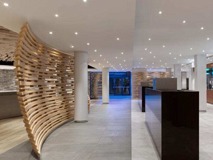Table Rock Centre functions as a portal through which one engages with the essence of Niagara Falls, the design concept is to evoke both the history and the natural wonder, threaded through the interior spaces by notions of thresholds, restoration/re-creation and metaphor. This was achieved by imbuing the interior spaces with details and design elements that are evocative of both the natural and the historic. For example, the restaurant and the main circulation hall (“the River”) with their natural materials and flowing forms suggest the organic; the retail area within the original Table Rock House is a re-creation and revealing of the more orthogonal, historic architecture.