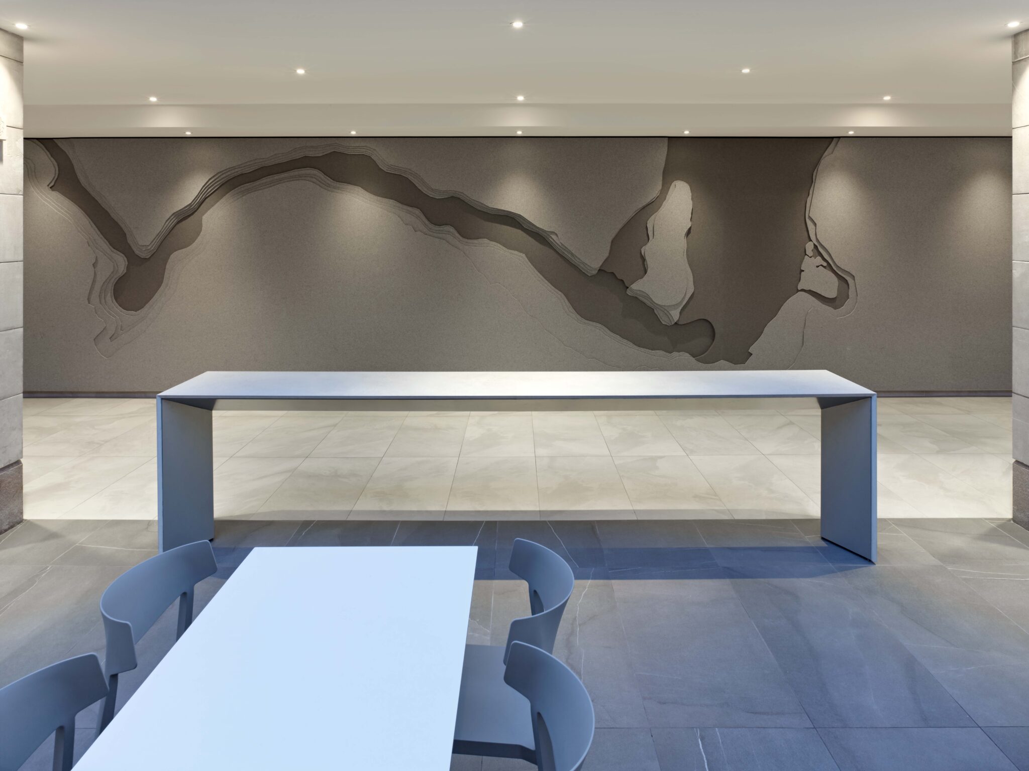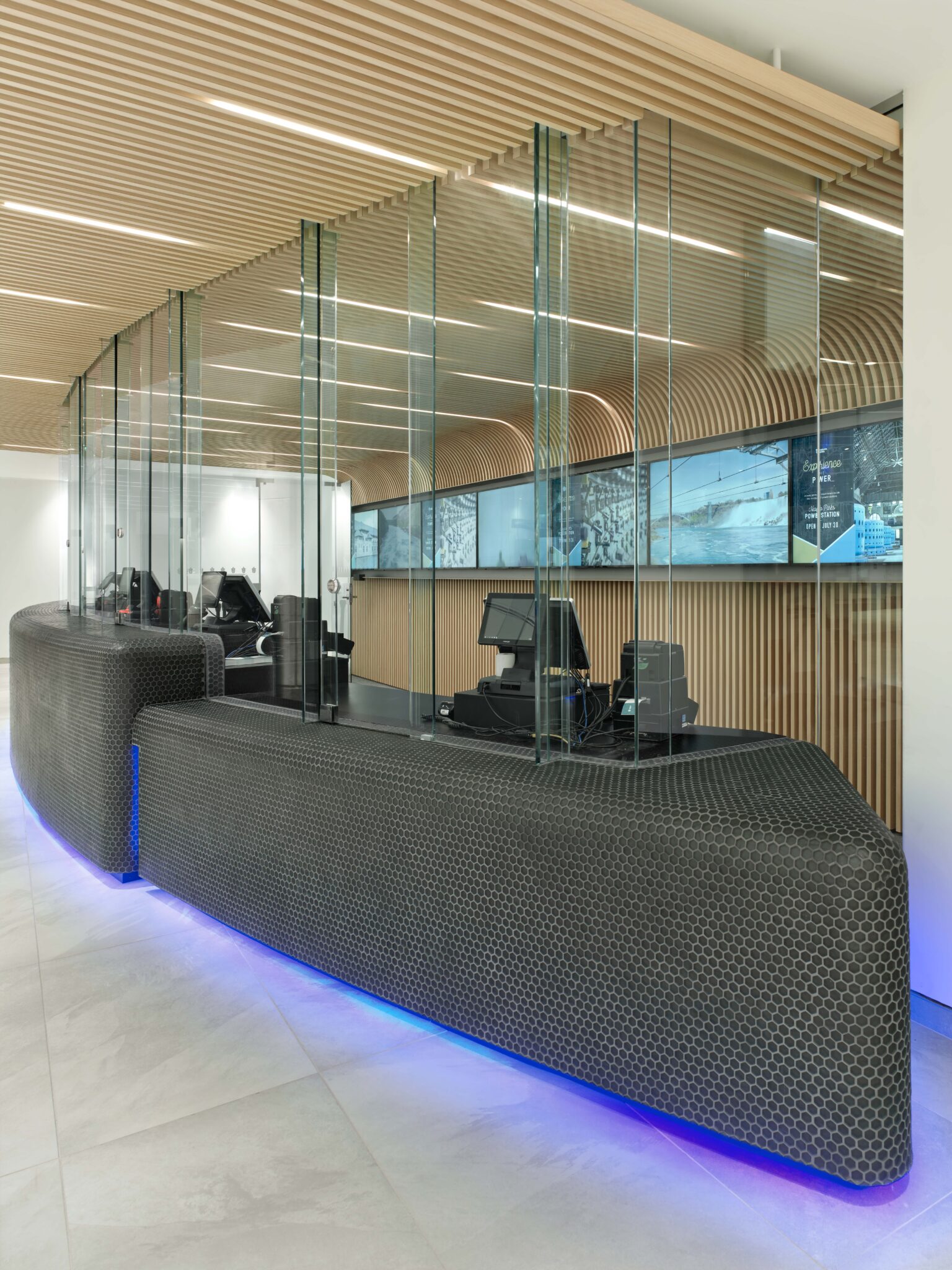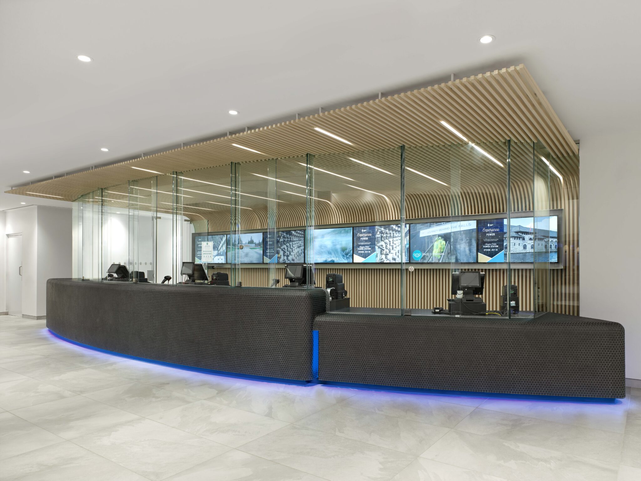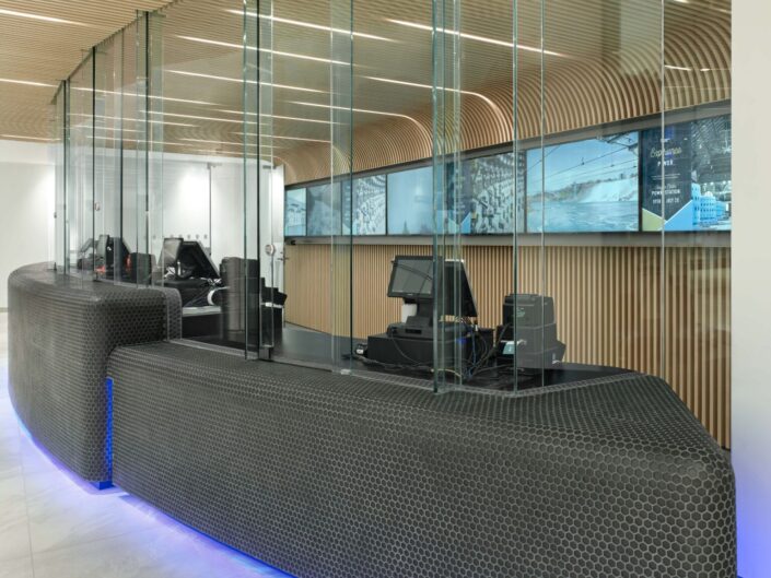 The Journey Behind The Falls, located on Level 1 and at the opposite end of the entrance end of the main circulation spine, ‘River”, is where patrons queue and purchase tickets for the unique experience to experience the Falls from behind the waterfall. Originally an exterior space, the work included enclosing and providing new mechanical/electrical systems to suit, refurbished washrooms, fast casual and associated dining spaces. The project included a new ticket/information counter. The unique shape of the counter, clad with mosaic tile and enclosed in glass, is intended to be evocative of nautical and organic forms. A custom-designed relief sculpture fabricated from layers of felt, a 3D map of the Niagara River, is featured in a dining area within the space.