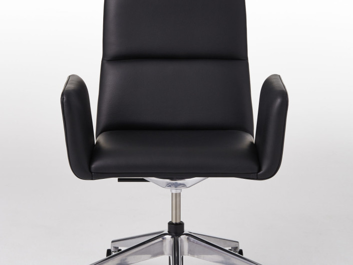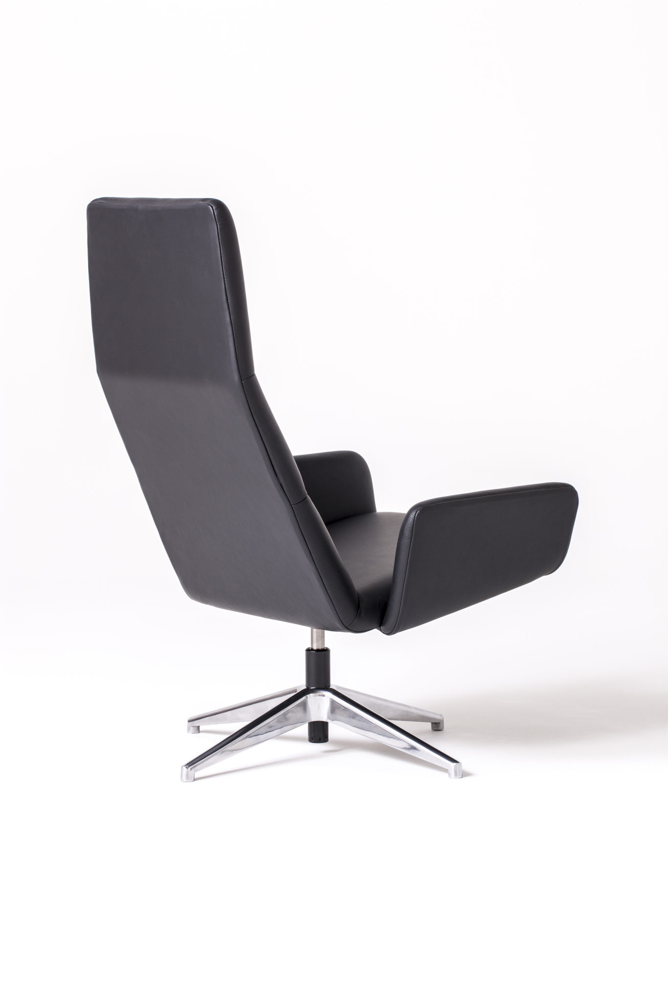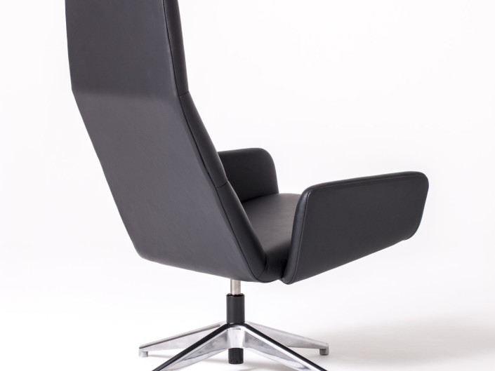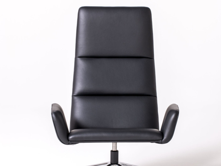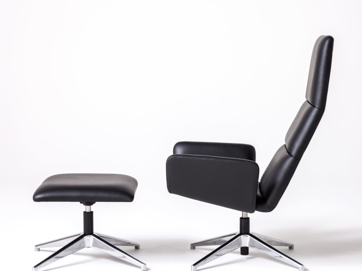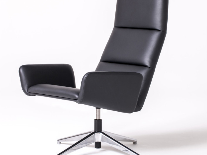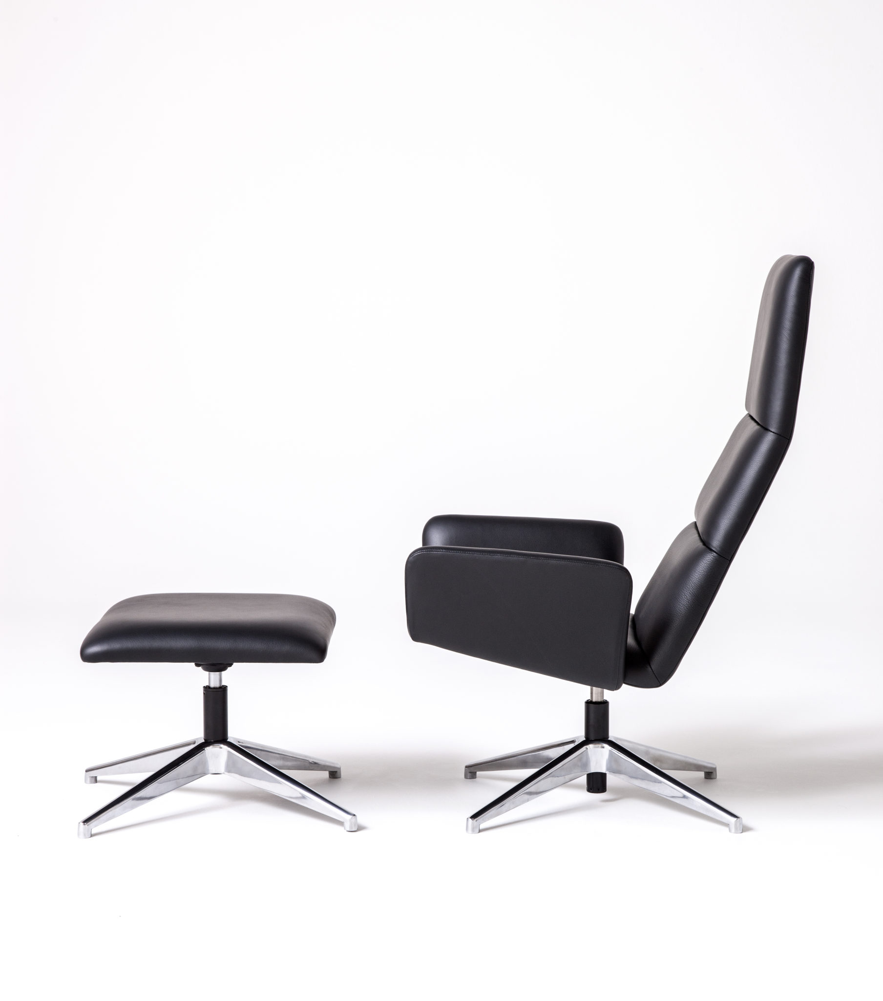 The Vuelo, seen throughout the space in various versions as both a side chair, lounge and wingback chair, evokes flight with its subtle winged arms. The lounge and wing-back lounge chairs (ideal for sleeping) sit facing the expansive windows where one can lean back and view actual take-offs and landings.