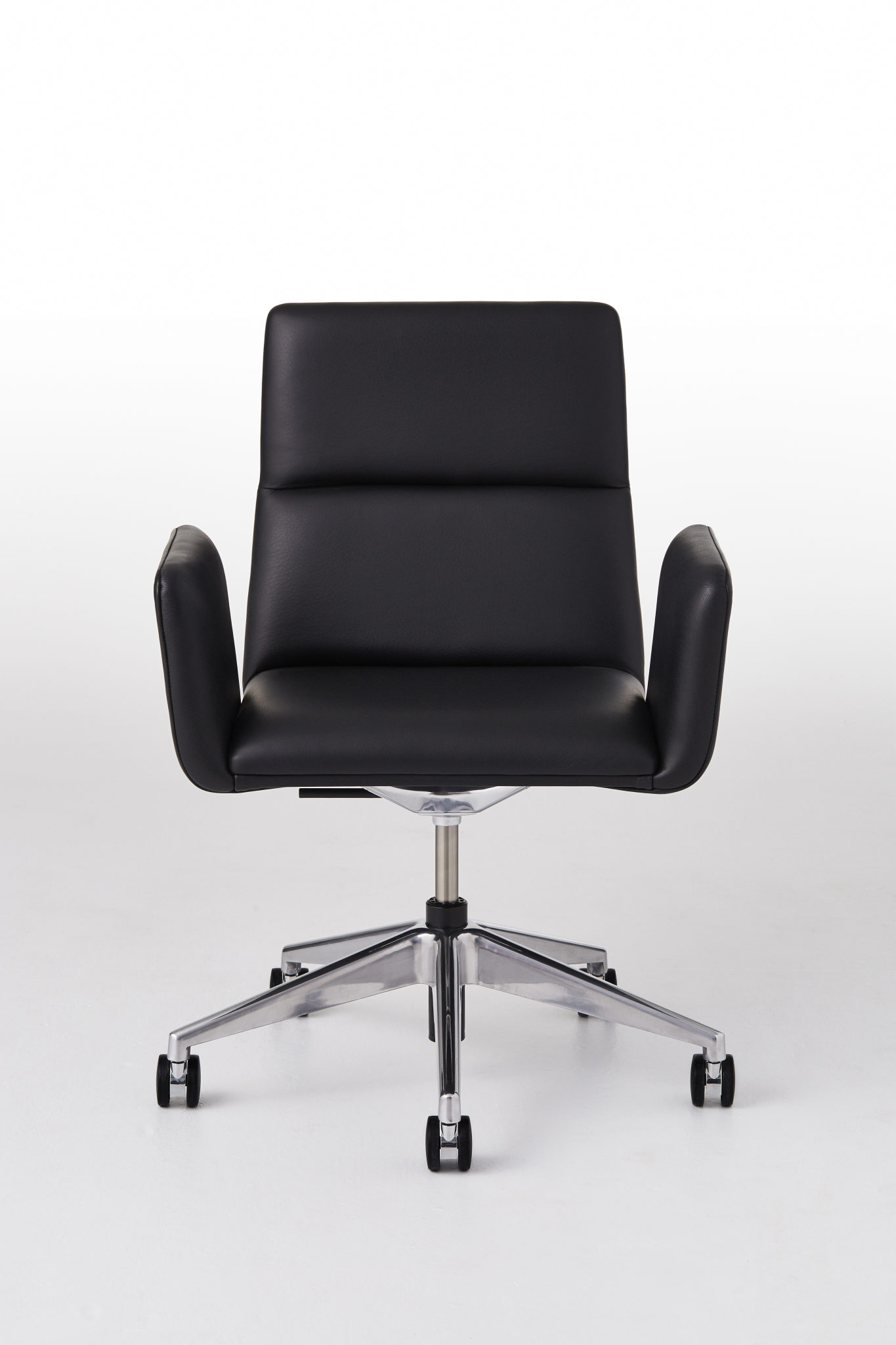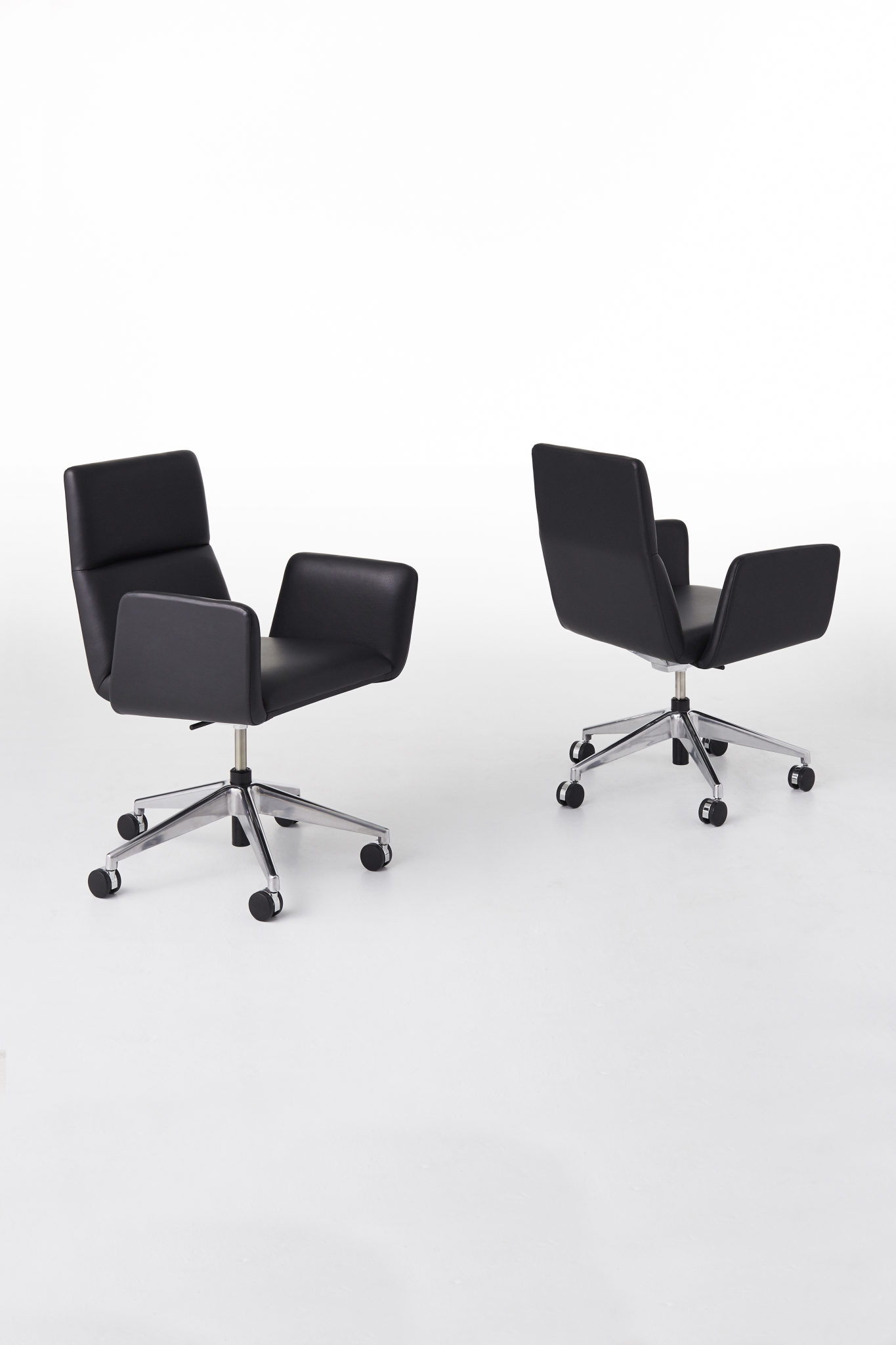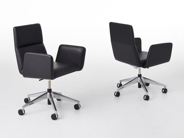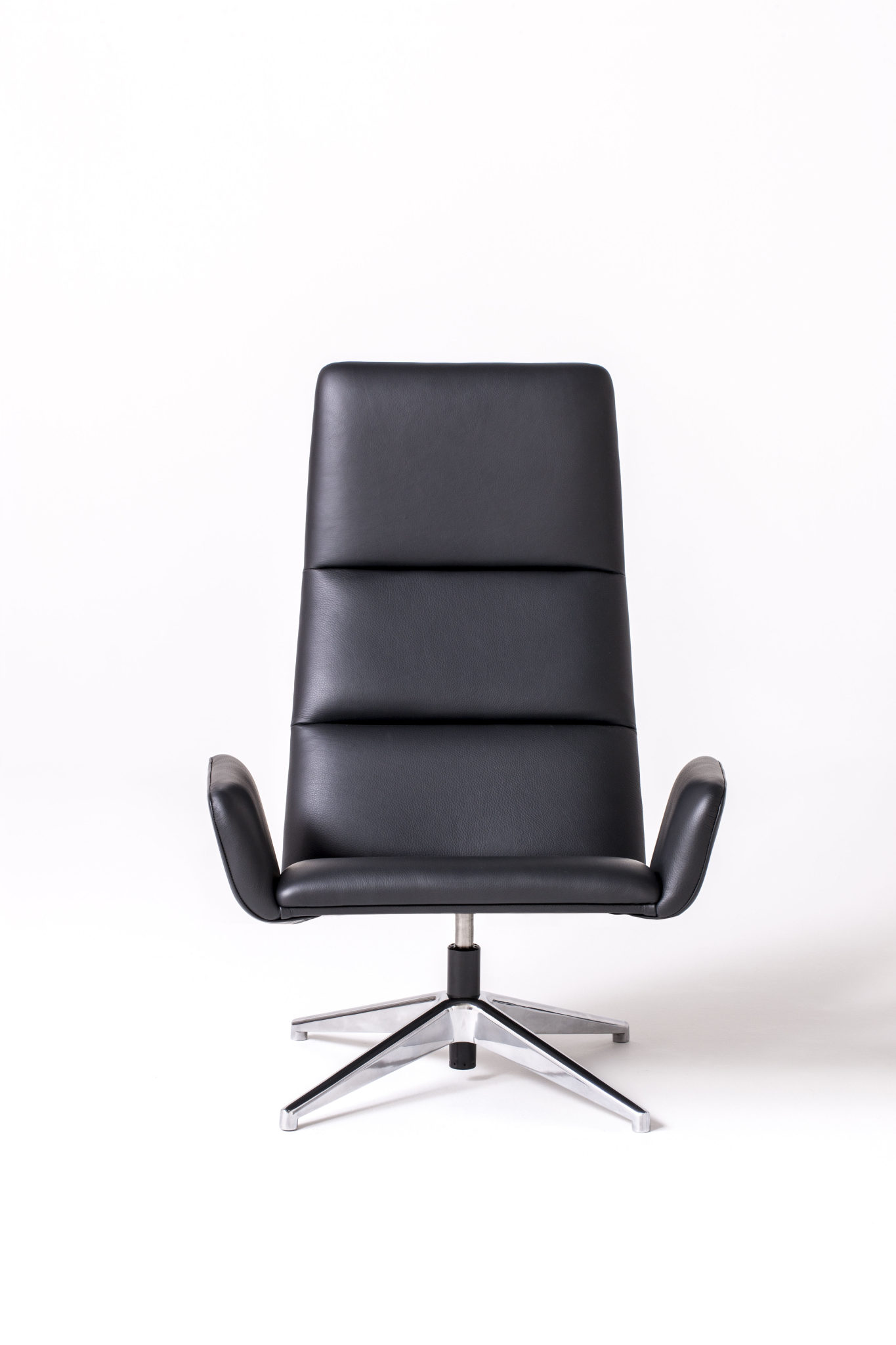 The Vuelo, seen throughout the space in various versions as both a side chair, lounge and wingback chair, evokes flight with its subtle winged arms. The lounge and wing-back lounge chairs (ideal for sleeping) sit facing the expansive windows where one can lean back and view actual take-offs and landings.
