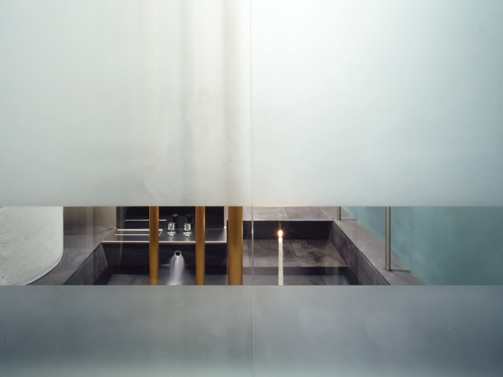 built-in candleholders. Experimenting with the act of viewing, the bathing area is like a stage set where one enacts the self-conscious performance of both watching and being watched.