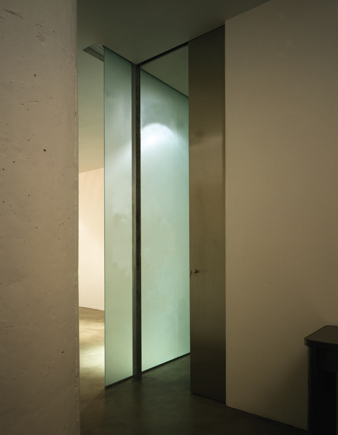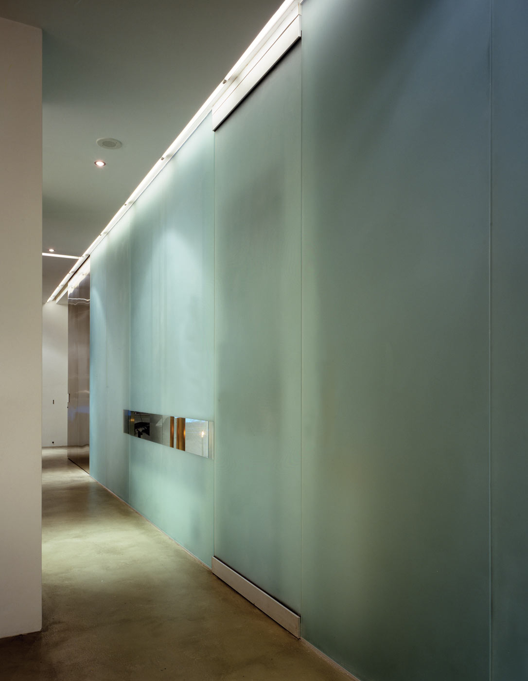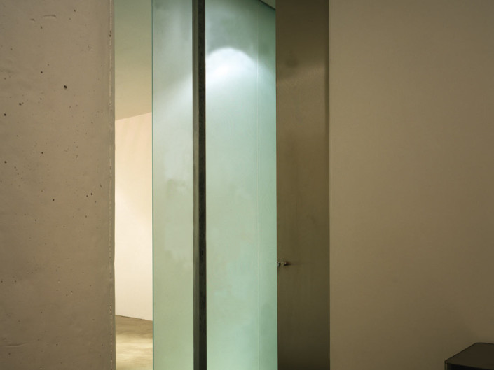 Housed in a converted warehouse in downtown Toronto, the 2,000SF loft is organized in a conventional strip with industrial windows at one end. All non-structural walls were removed and a wall dividing the public and private areas was replaced with a 25’ sandblasted glass screen. Layering with a sliding partitions of varying dimensions, views through rooms change as these panels move and entice with sections of clear and translucent glass – transforming and revealing one area as they conceal another. The largest of these partitions – a dramatic section of 15’ stainless steel – separates the bedroom/bath from the living room.
