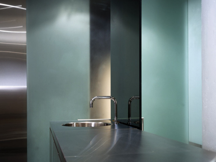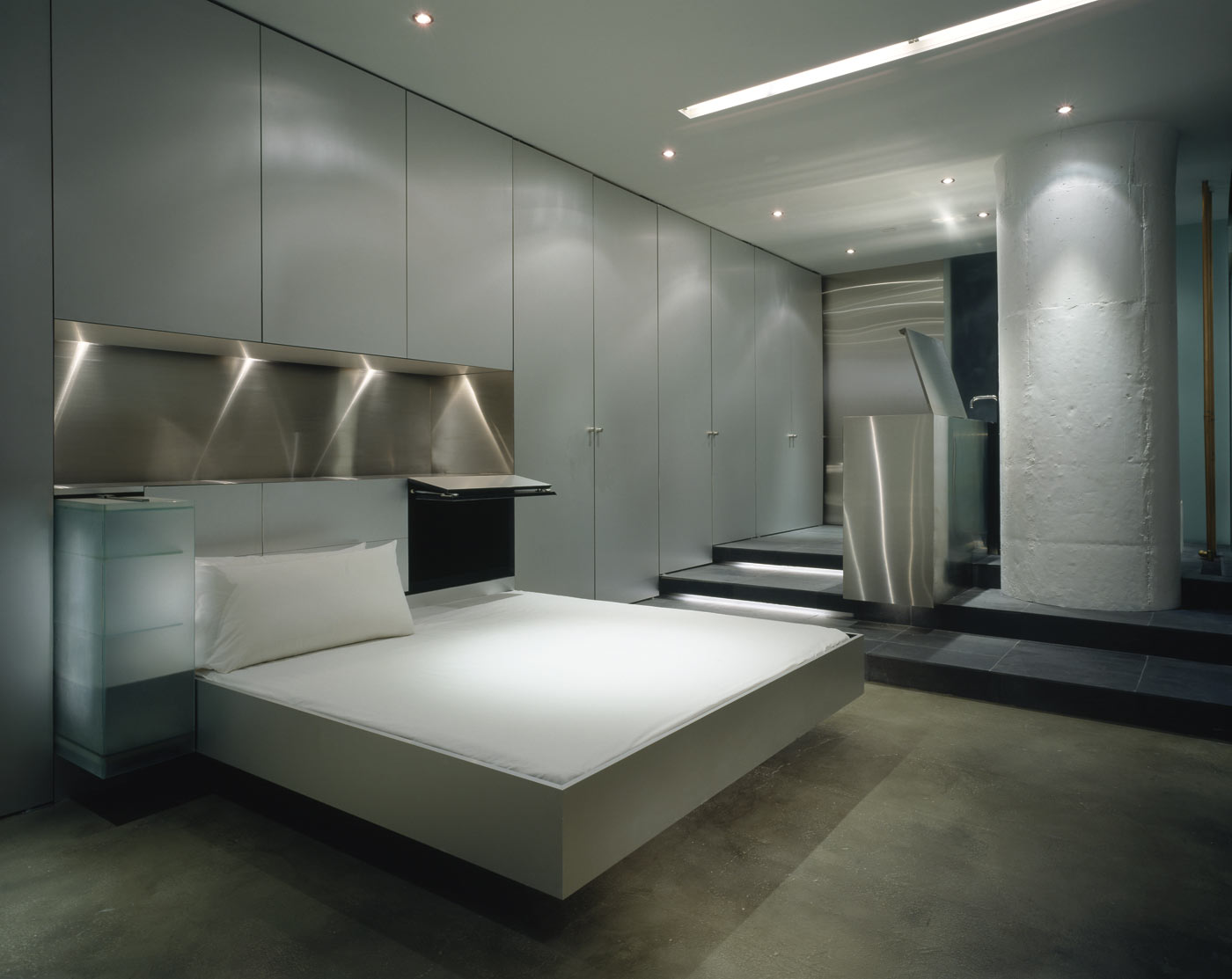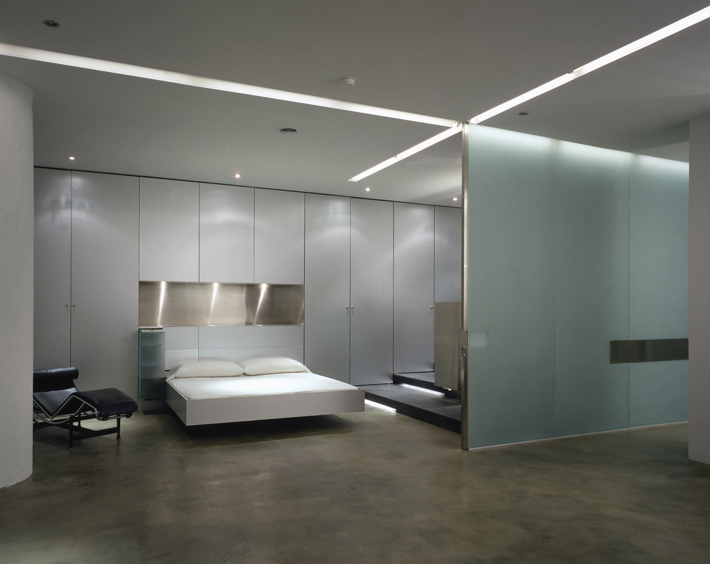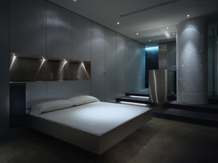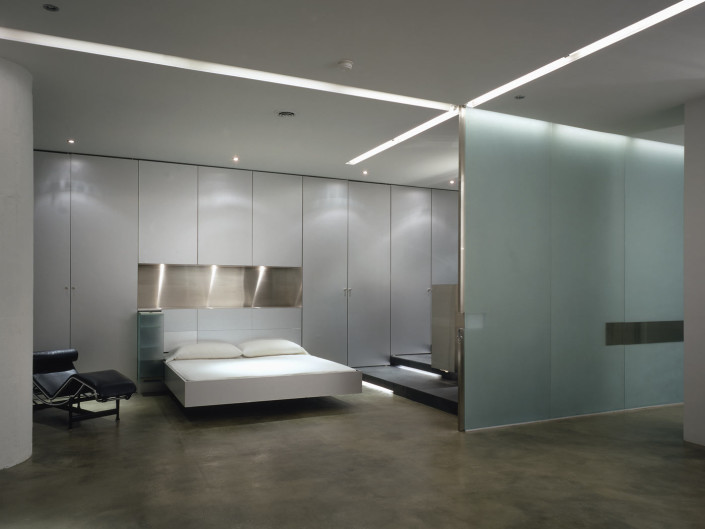 Though bare and elemental, the liberal use of glass, aluminum, stainless steel and slate impart an unexpected glow and warmth to the interior, specific to the materials themselves. Subtle nuances and reflections in the aluminum and stainless steel reveal themselves through lighting, playing off surfaces, lending a sculptural, ephemeral quality to the bed and freestanding vanity. Using light as a theatrical element, halogen and fluorescent fixtures are used in a variety of combinations to re-define space, use, and atmosphere. Intersecting ceiling-mounted recessed fluorescent lighting provides general ambient lighting while halogen and accent lighting are strategically positioned to subtly highlight existing and new details and textures.