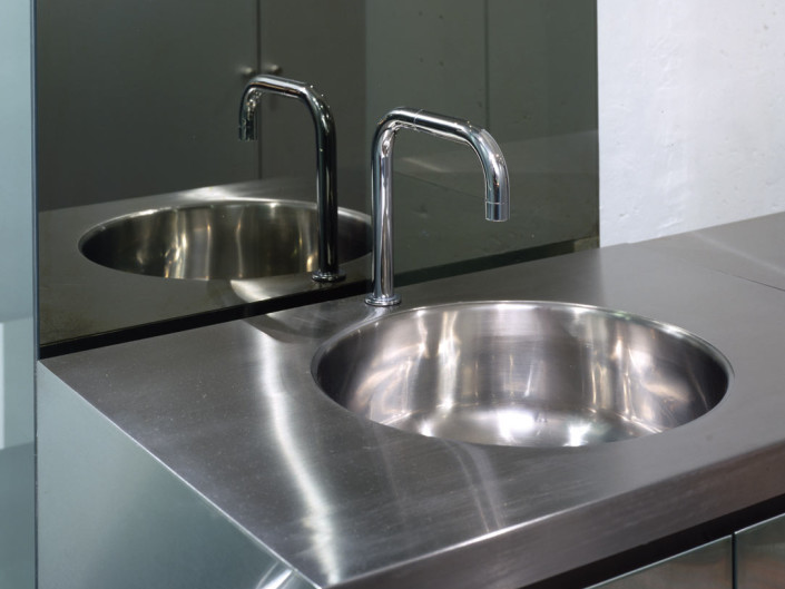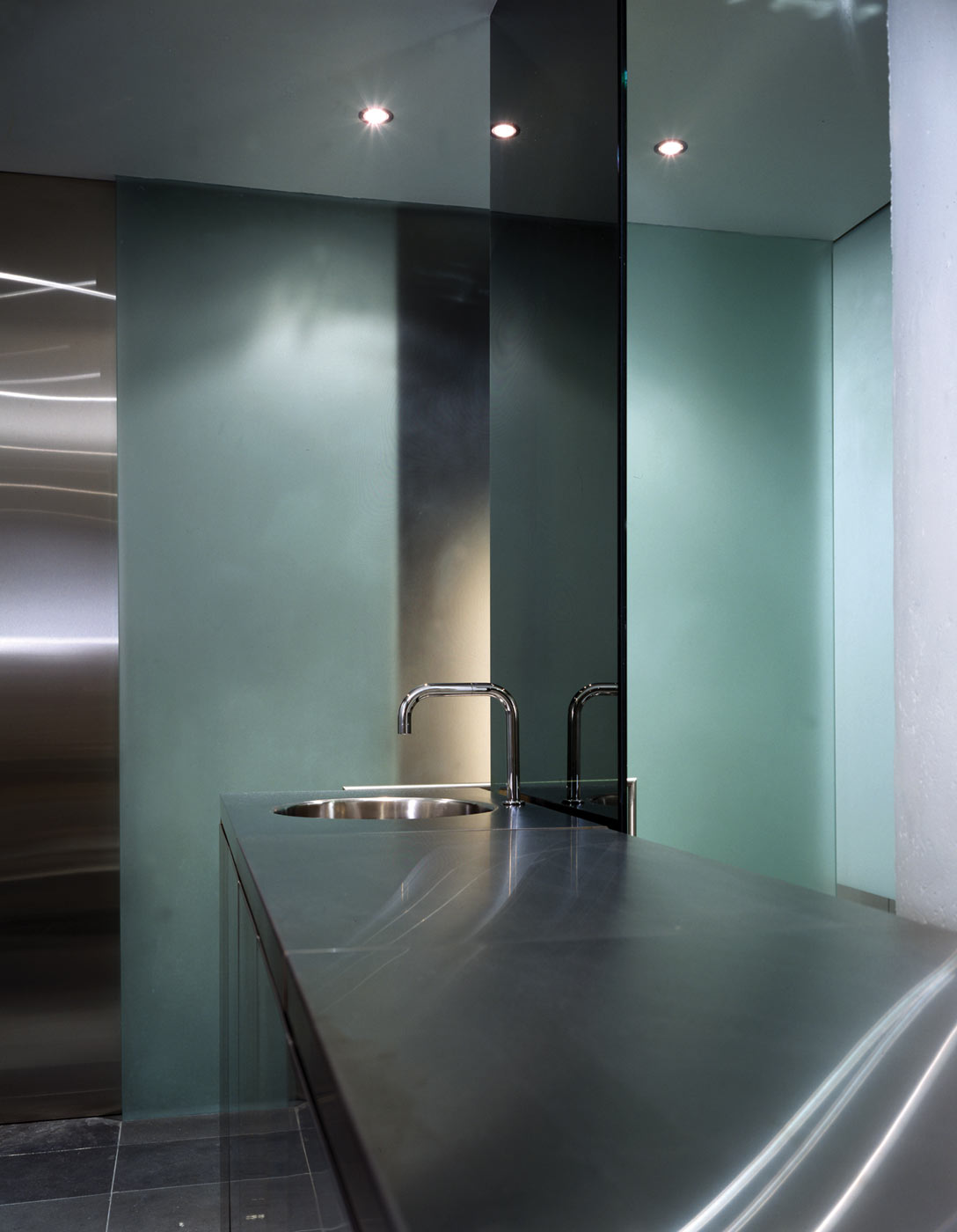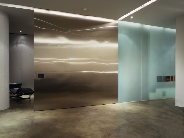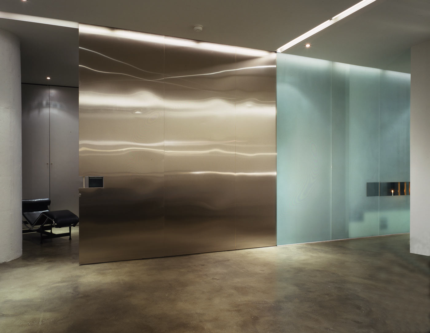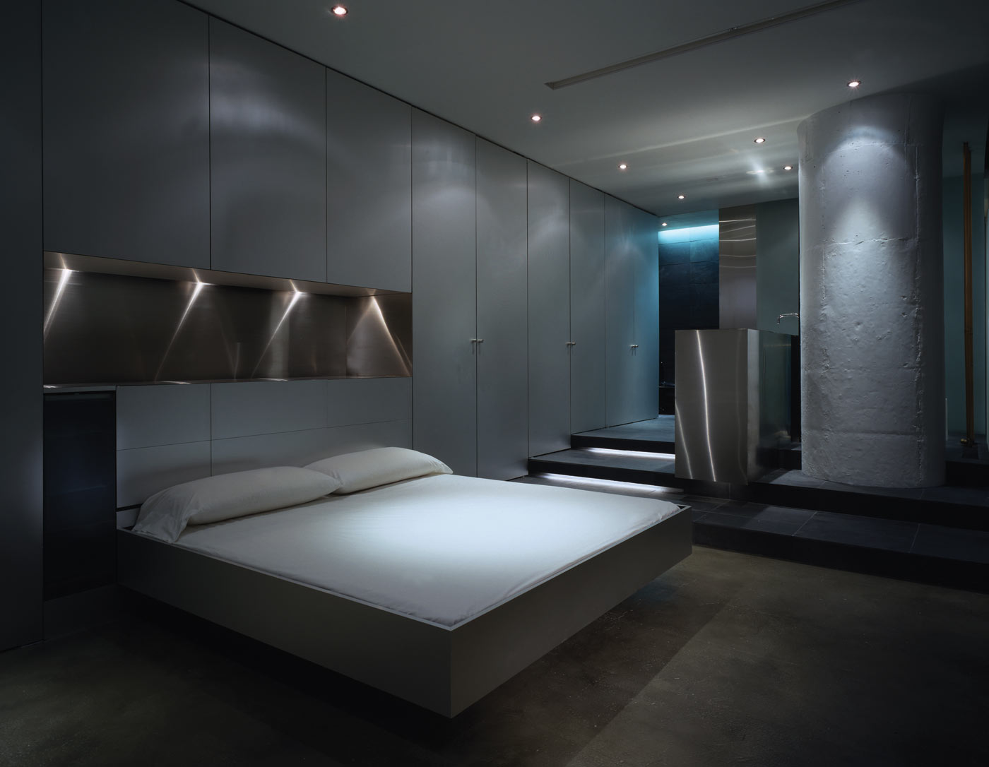 Though bare and elemental, the liberal use of glass, aluminum, stainless steel and slate impart an unexpected glow and warmth to the interior, specific to the materials themselves. Subtle nuances and reflections in the aluminum and stainless steel reveal themselves through lighting, playing off surfaces, lending a sculptural, ephemeral quality to the bed and freestanding vanity. Using light as a theatrical element, halogen and fluorescent fixtures are used in a variety of combinations to re-define space, use, and atmosphere. Intersecting ceiling-mounted recessed fluorescent lighting provides general ambient lighting while halogen and accent lighting are strategically positioned to subtly highlight existing and new details and textures.