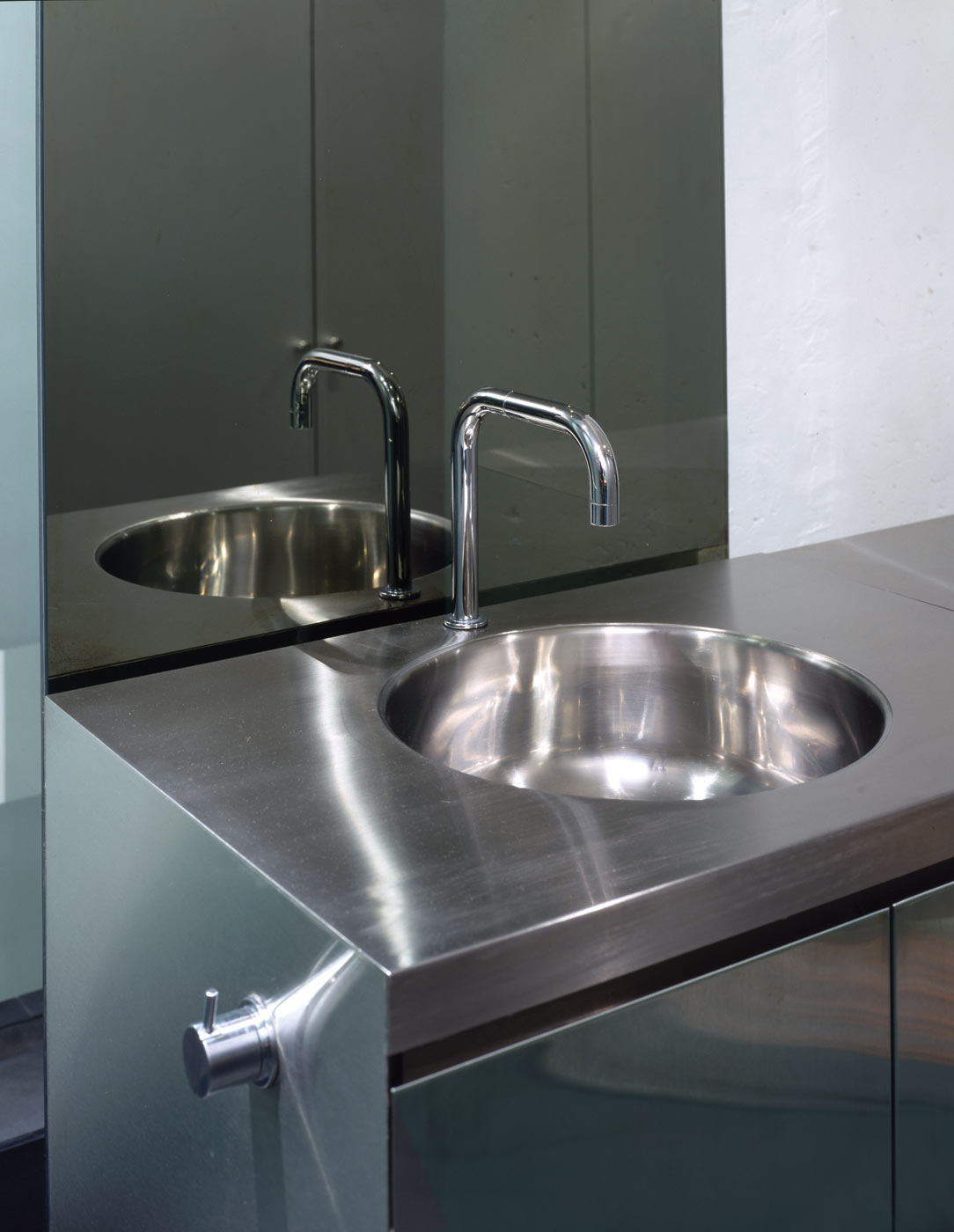 Designing everything essential to living directly into the space is an integral part of the designer’s creative philosophy; creating ‘a narrative of habitation’ – or composing a ‘script’ for the client. The bed (aluminum-clad and king-sized) is cantilevered from the wall so that it appears to hover in mid-air. A glowing bedside ‘command module’ constructed of acid-etched glass slides open to access light switches, thermostat, telephone and fan. Aluminum floor-to-ceiling doors concealing storage closets span the entire length of bedroom and bathing areas, functioning as a backdrop the activities and elements within.